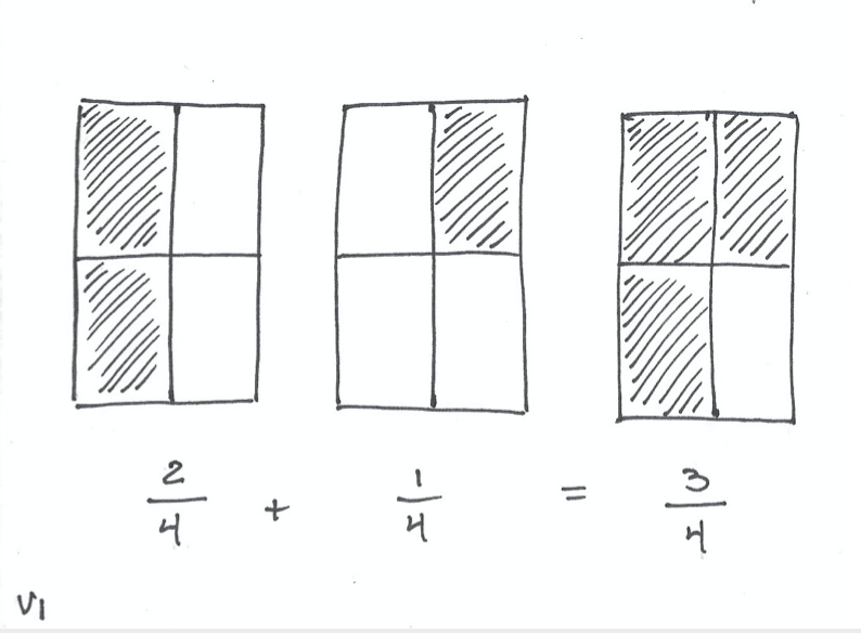4. Additionner et/ou soustraire — Dessiner trois rectangles au tableau et résoudre une équation simple : 3/4 – 1/4 = 2/4. Hachurer les parties de la fraction.