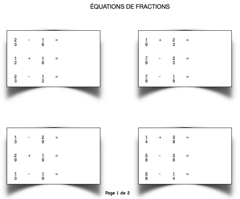 3. Réaliser une exposition : placer les dessins d’une même équipe de façon à représenter une équation. Écrire les fractions sur des petites cartes et placer sous chaque dessin.