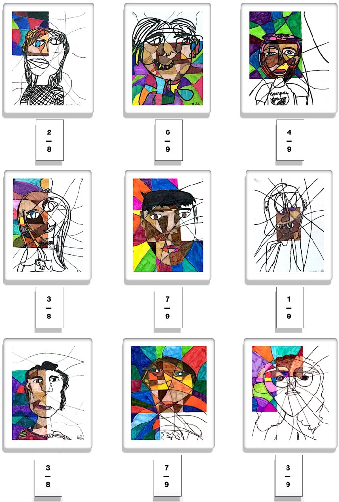 4. Fixer les réalisations au mur, écrire les fractions sur des petites cartes et jouer à trouver leur emplacement ; placer une fraction sous chaque dessin.