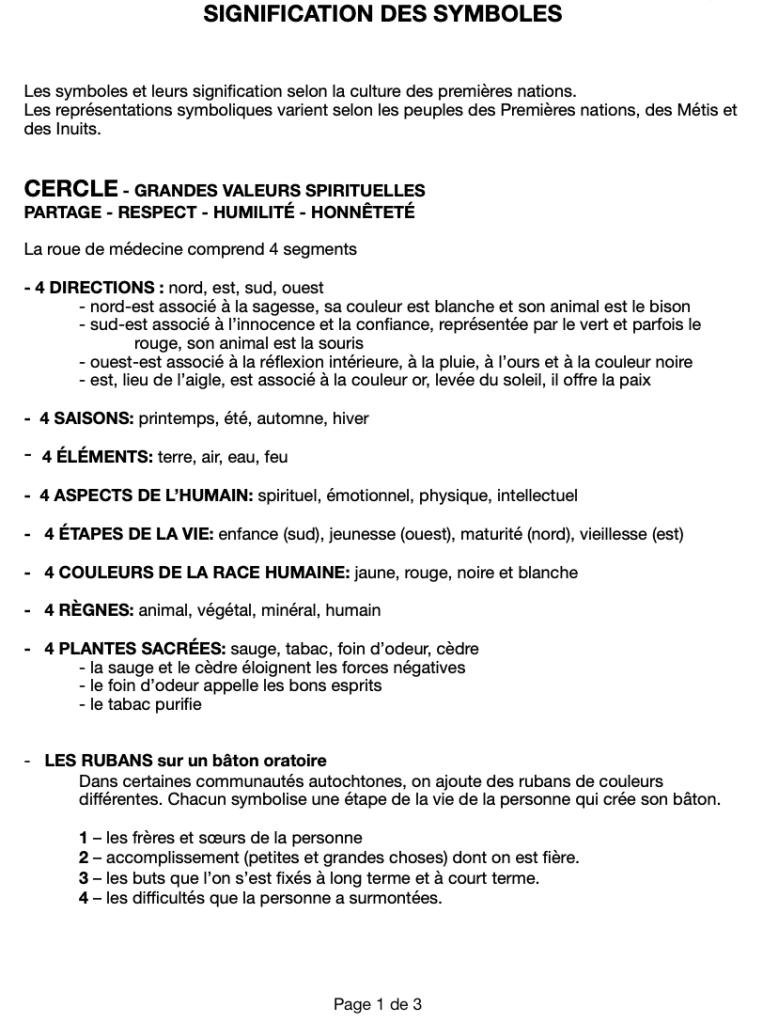 13. Écrire la signification de chaque élément (ils peuvent avoir plus d’une signification) et tracer une flèche pour indiquer l’endroit où se trouve cet élément (p. ex. : une ligne noire représente l’harmonie et l’écoute ; elle est une des quatre couleurs de la race humaine). Écrire un mot sur le bâton en français ou en langue innue. Voir : http://dictionnaire.innu-aimun.ca/Words.