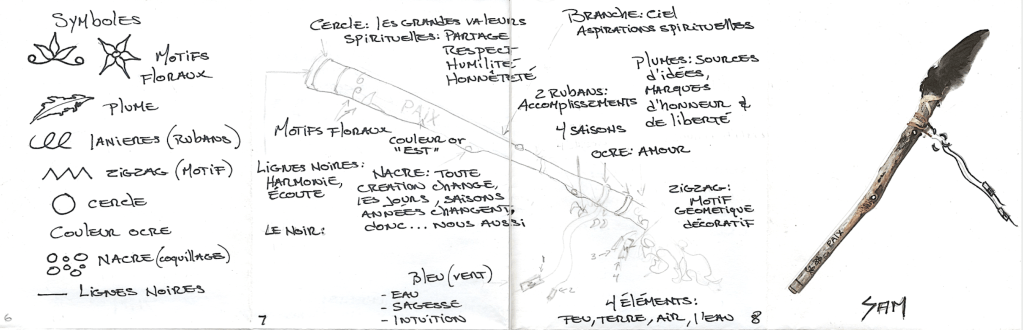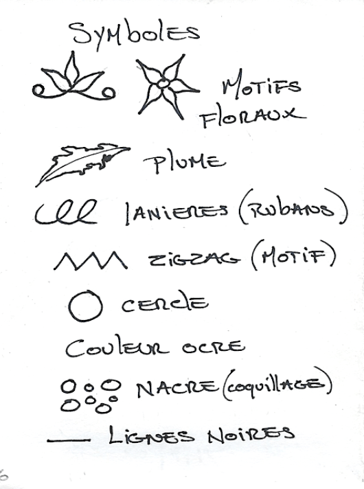 Page 6 : dessiner des symboles attribués aux arbres, animaux, couleurs, pierres, plumes, etc.