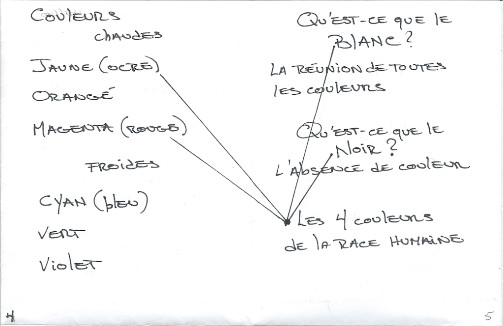 7. Qu’est-ce que le blanc et le noir en arts visuels ? Le blanc est la réunion de toutes les couleurs et le noir est l’absence de couleur. Quelles sont les quatre couleurs de la race humaine selon les Innus ? Jaune (ocre), rouge, noir et blanc. Écrire à la page 5. Tracer des flèches qui indiquent les quatre couleurs.