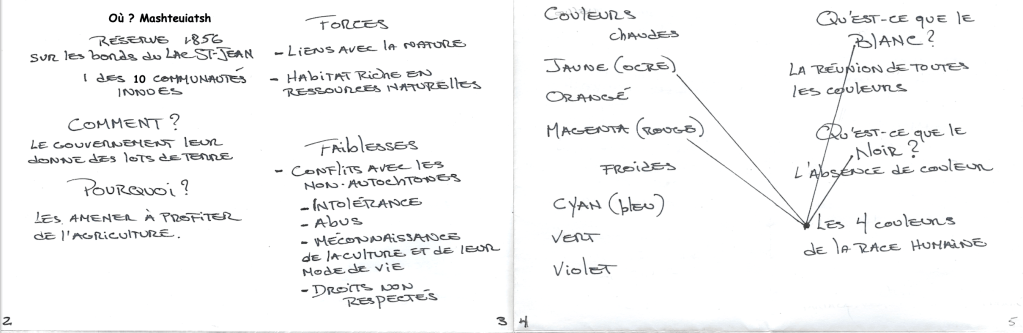 5. Définir un problème — Les forces et faiblesses (contraintes) d’un peuple. Écrire au tableau les forces (p. ex. : liens forts avec la nature, habitat riche en ressources naturelles) et les faiblesses (p. ex. : conflits avec les non-Autochtones ; intolérance, abus, méconnaissance de la culture et du mode de vie des Innus, non-respect de leurs droits). Choisir et écrire deux forces et deux contraintes à la page 3. Sommes-nous (les colonisateurs et leurs descendants) respectueux de leur territoire et pourquoi ? À tour de rôle, prendre le bâton de paroles et donner son point de vue sur l’organisation du territoire de Mashteuiatsh.