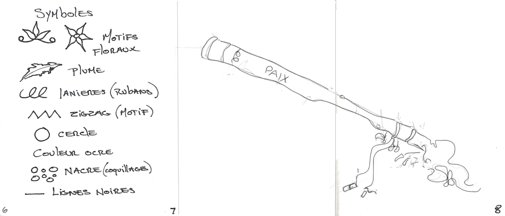 11. Planification — Dessiner les lignes de contour de son bâton et organiser les éléments choisis, pages 7 et 8. Ouvrir le carnet de traces de façon à voir la page 6. Retracer les lignes de contour du bâton au crayon-feutre noir.