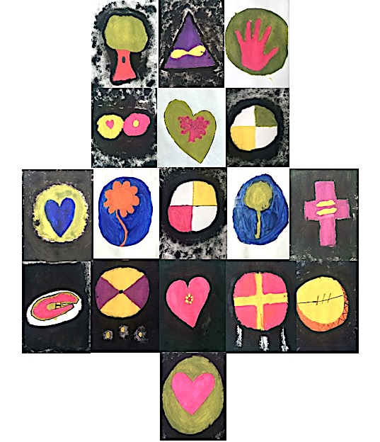 14. Démonstration — Dessiner son symbole sur du carton ou papier aquarelle, au crayon à mine d’abord, puis retracer au crayon-feutre noir. Placer et déplacer le papier de façon à être à l’aise en tout temps.