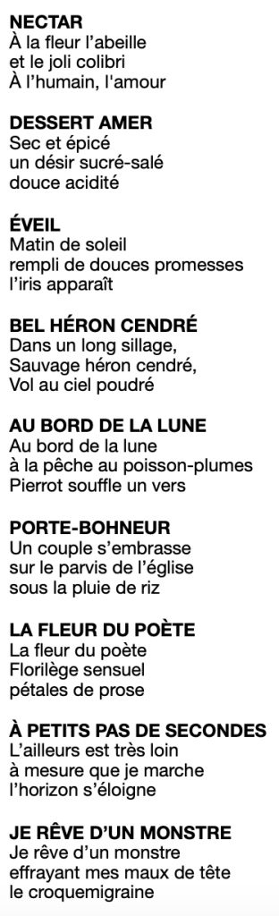 1. Présentation de l’artiste et du projet. Qu’est-ce qu’un haïku ? C’est une forme codifiée et très poétique d’origine japonaise. Consulter les haïkus populaires et la signification du haïku (sur le TBI). Qu’est-ce que la poésie ? C’est l’art d’évoquer et de suggérer les sensations, les impressions, les émotions les plus vives par l’union intense des sons, des rythmes, des harmonies, en particulier par les vers ; du grec création.