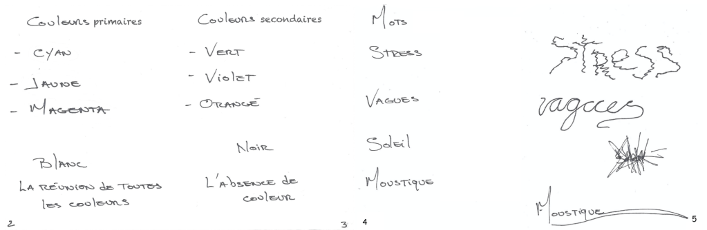– L’enseignant s’assure que les éléments suivants figurent dans les carnets de traces : trois couleurs secondaires et courte description du blanc (page 2), trois couleurs primaires et courte description du noir (page 3), quatre couleurs choisies soit, une pour chaque mot (page 7), mots dessinés avec la technique apprise (page 8), trois bouts de papier numérotés.