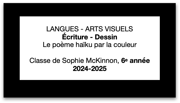 3. Réaliser une exposition : écrire le titre du projet, le nom de l’enseignant.e ainsi que l’année en cours sur une carte et fixer la carte en haut des réalisations. Trouver un titre pour son haïku et écrire sur une petite carte (p. ex. : SOUS LA PLUIE), fixer sous sa réalisation.