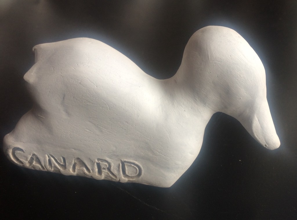 LE CANARD – Argile (peint au gesso), 4 x 5 x 2 pouces.