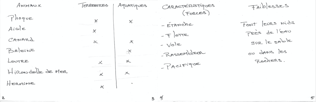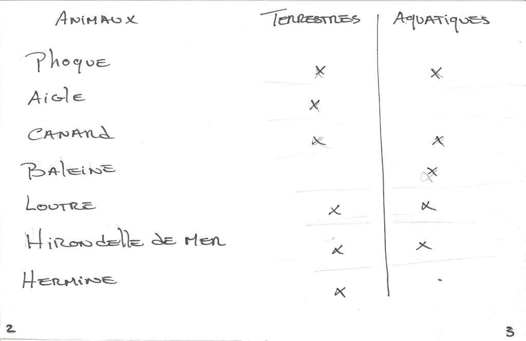 6. Diviser la page 3 en deux. Tracer des X sur deux colonnes afin d’identifier les animaux terrestres et aquatiques.