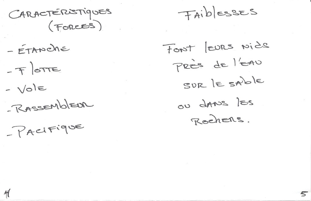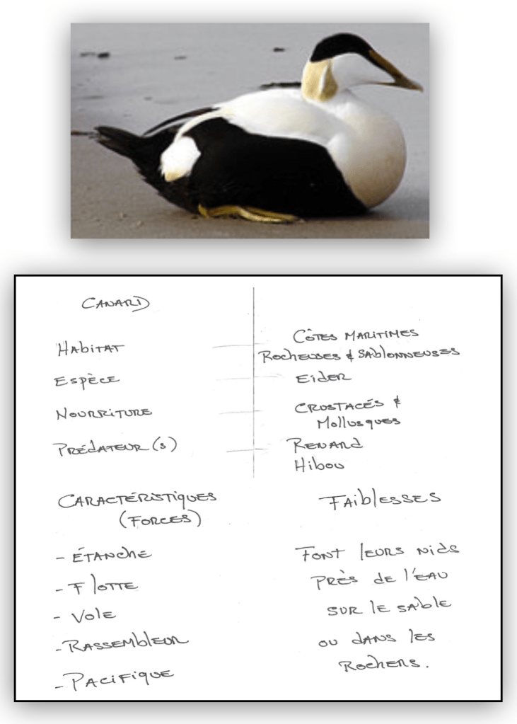 9. Organiser l’information — Écrire les forces de l’animal choisi (p. ex. : le canard), page 4, et les faiblesses, page 5.