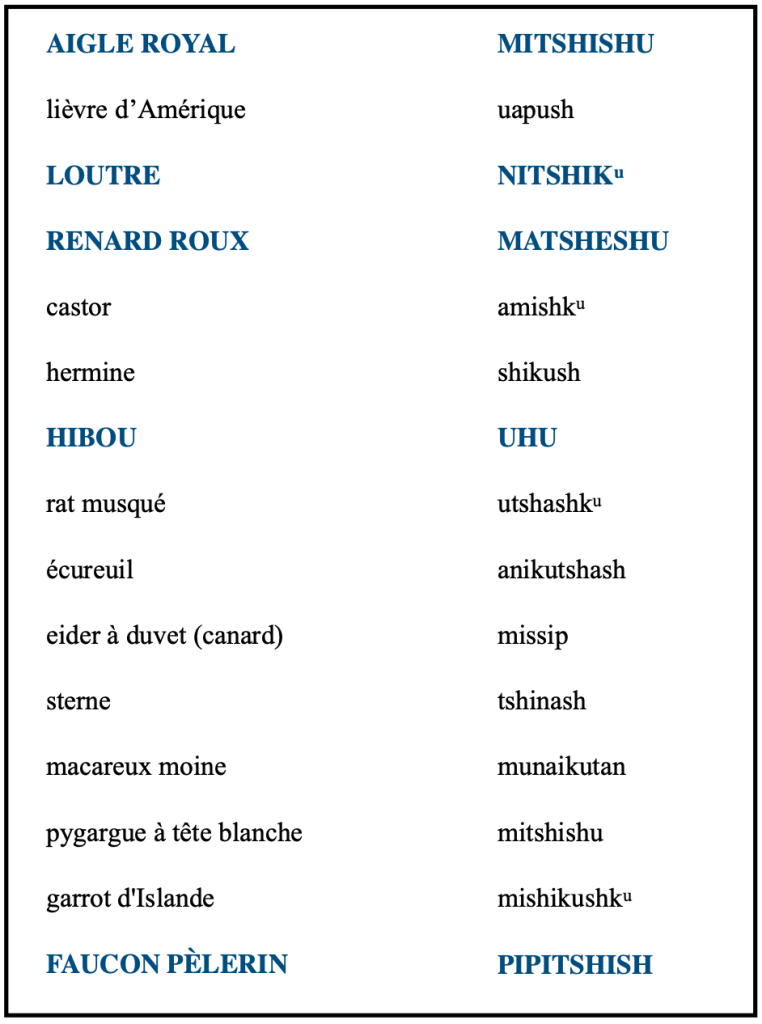Préparer sur le TBI (tableau blanc interactif) la liste des noms d’animaux en français et en langue innue (innu-aimun).