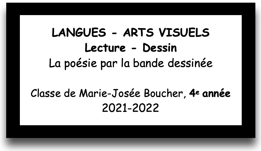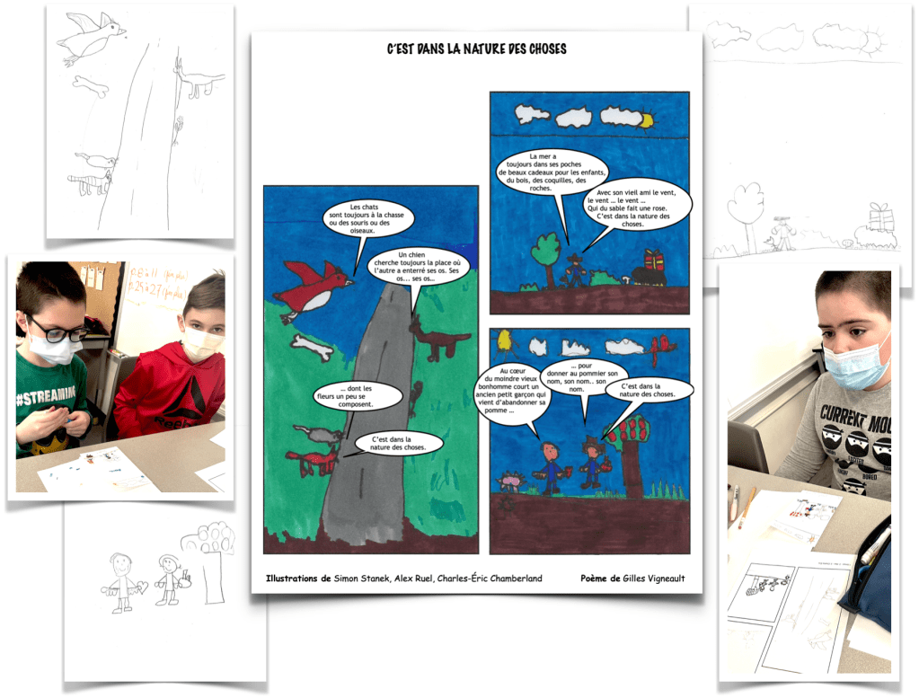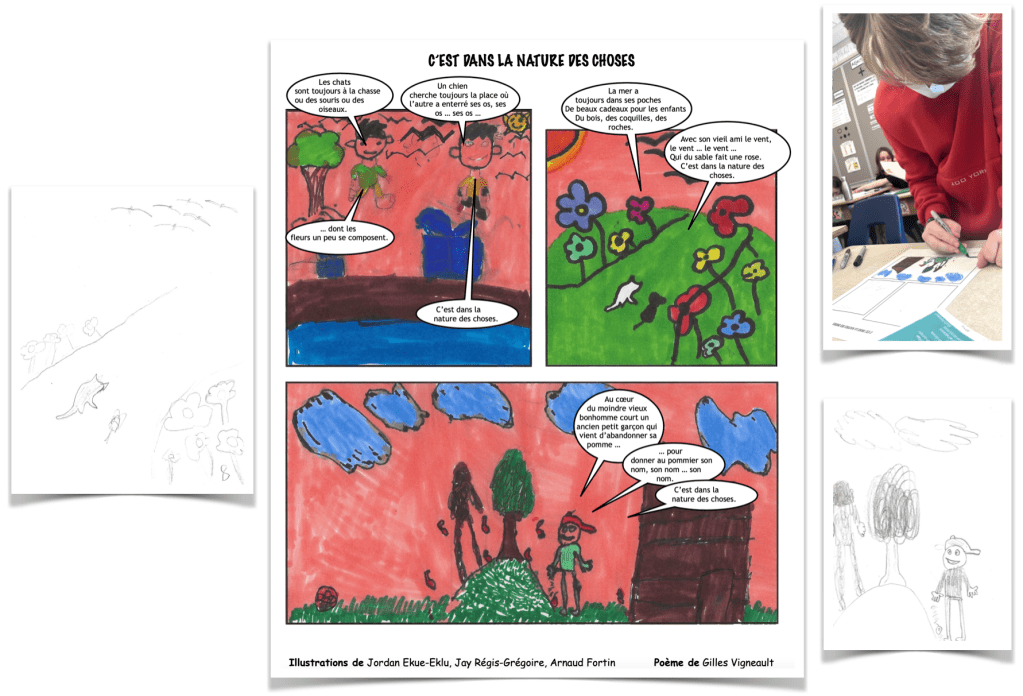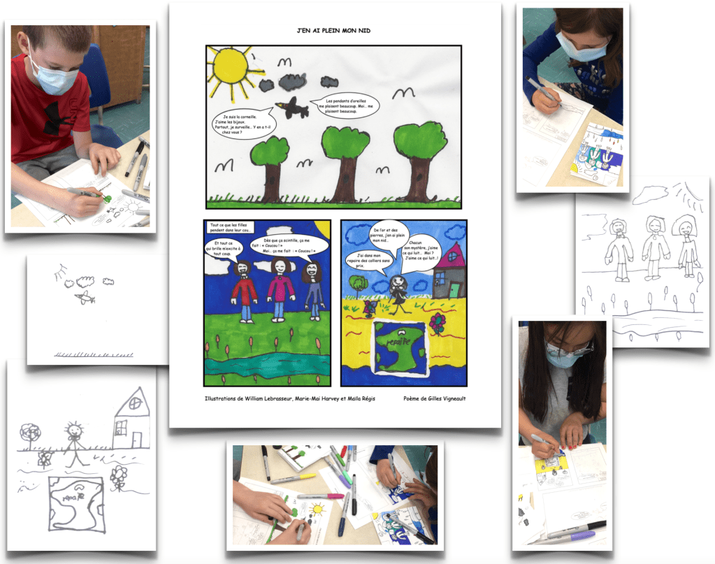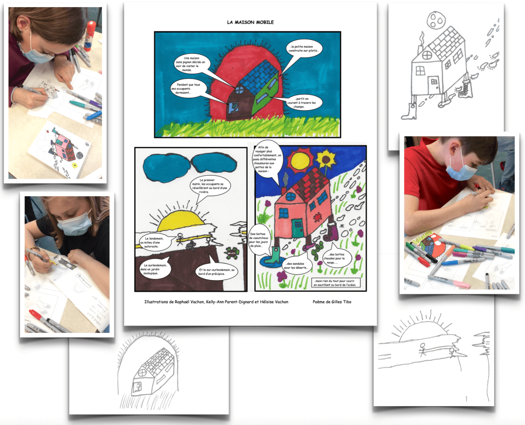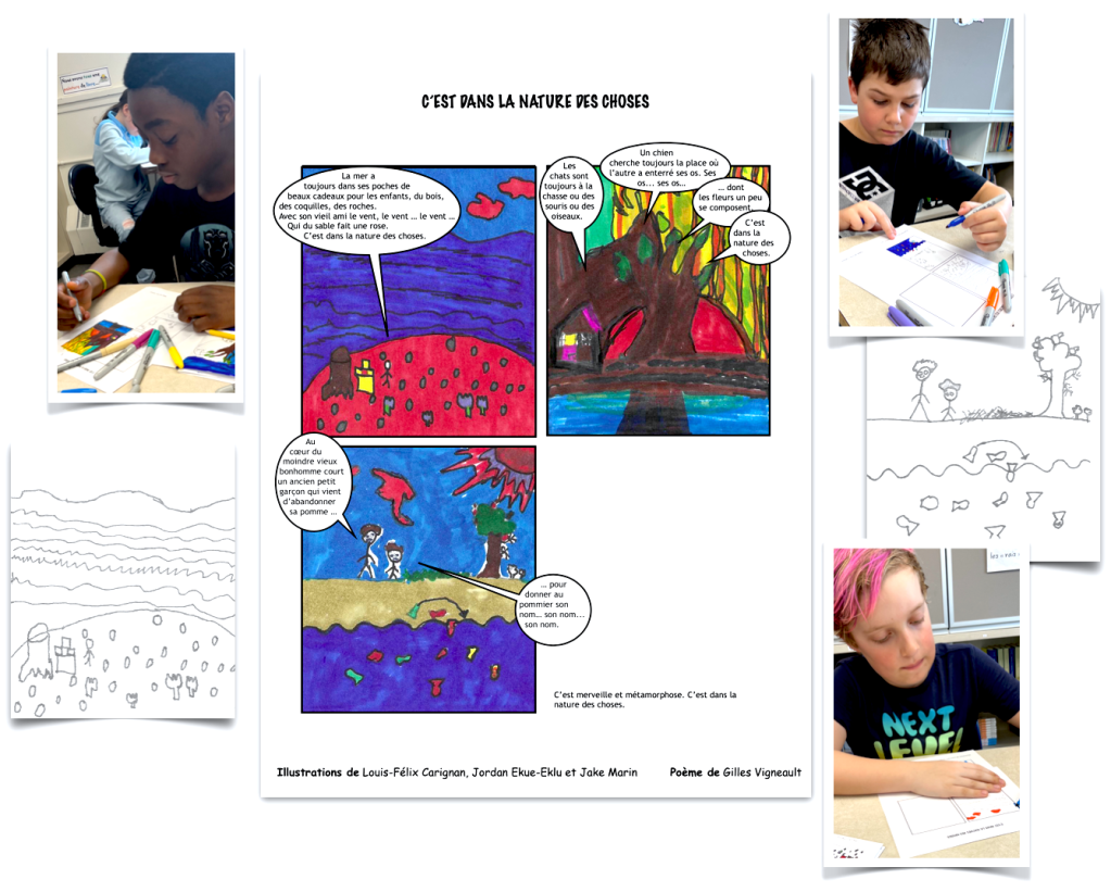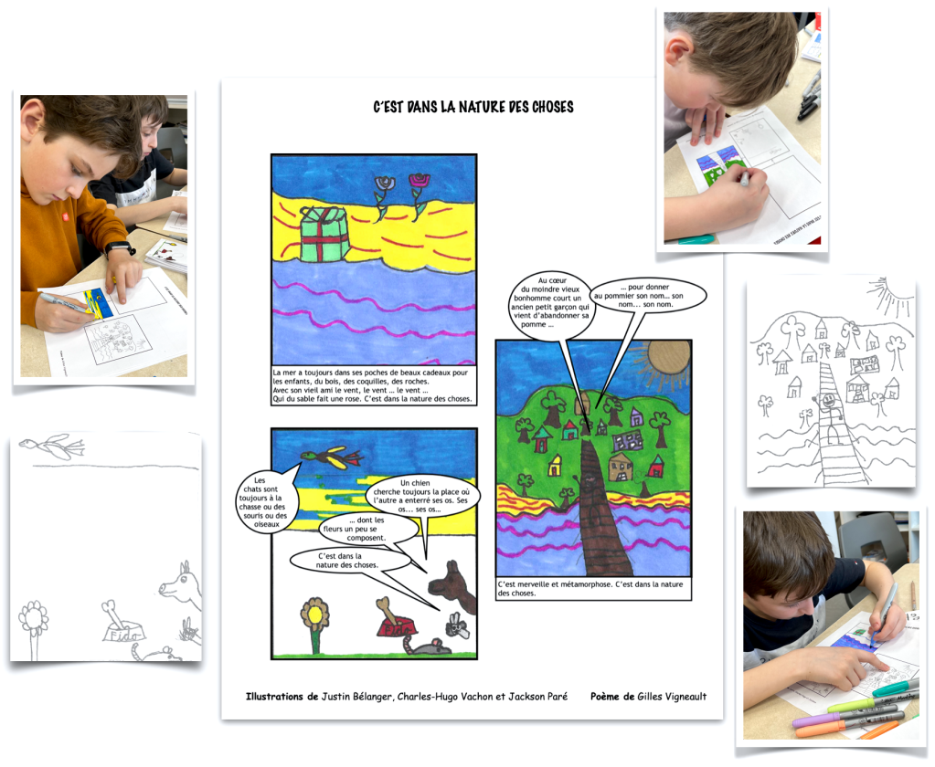 Que c’est magnifique!!! J’ai évalué le projet, je l’ai affiché dans le corridor et j’ai remis à chaque élève leur copie en couleur que tu leur avais préparée. Que de fierté j’ai vu dans leurs yeux! Les élèves et moi avons eu énormément de plaisir à travailler avec toi. Tu as vraiment bien saisi les sujets que je désirais que nous exploitions avec les élèves : poésie et bande dessinée.