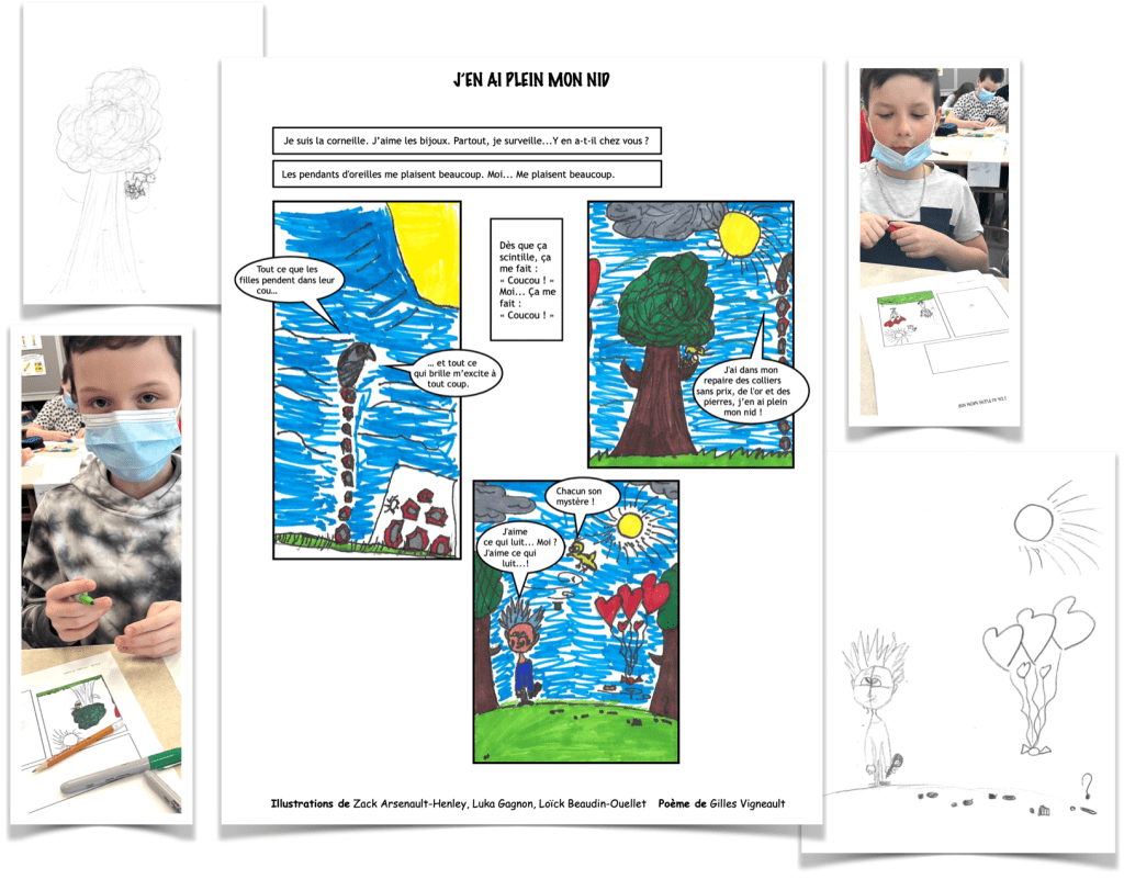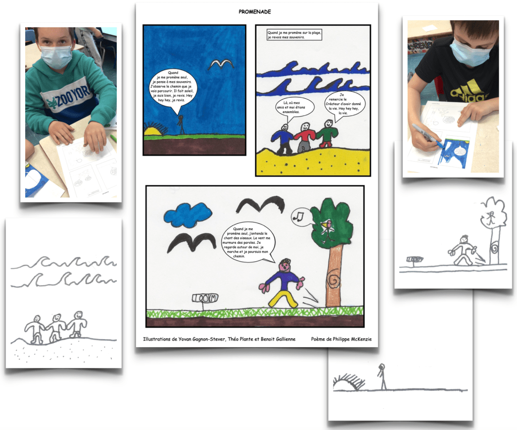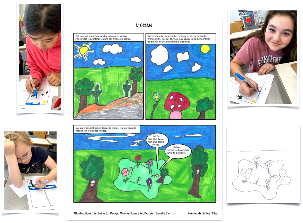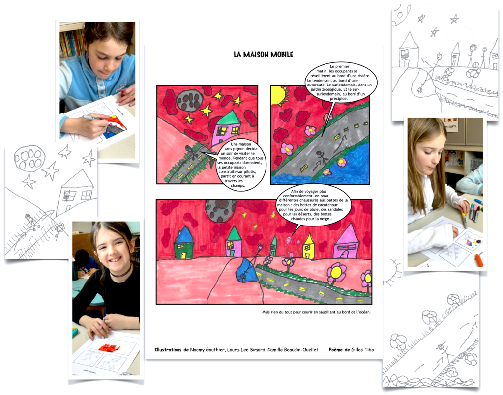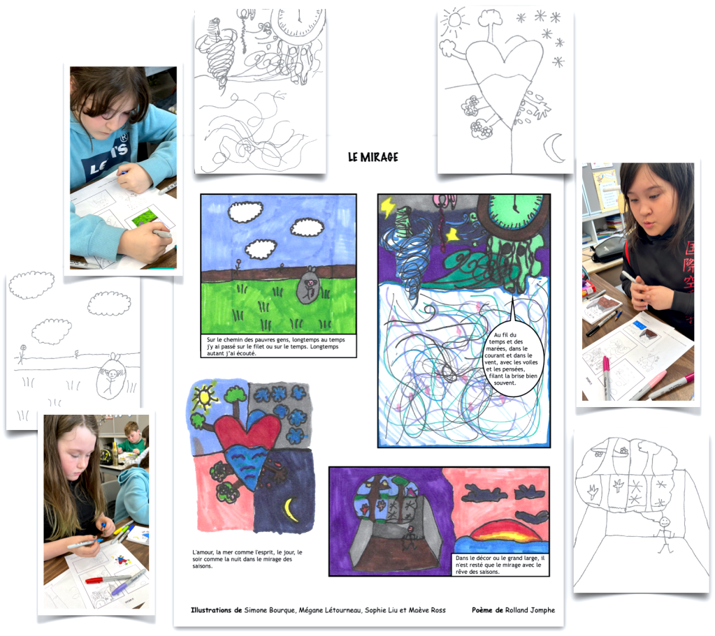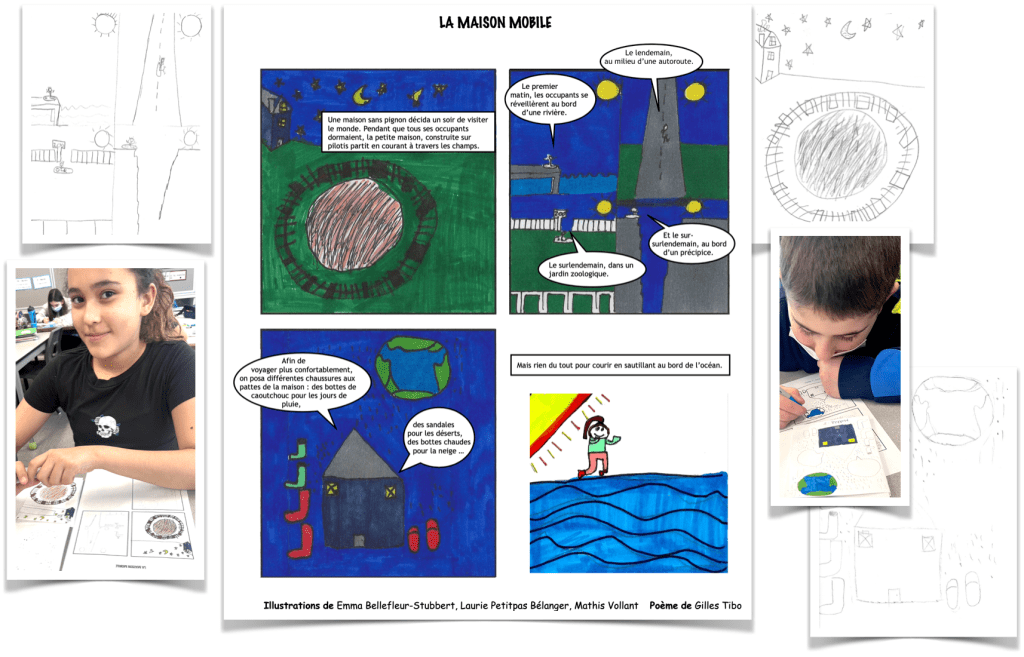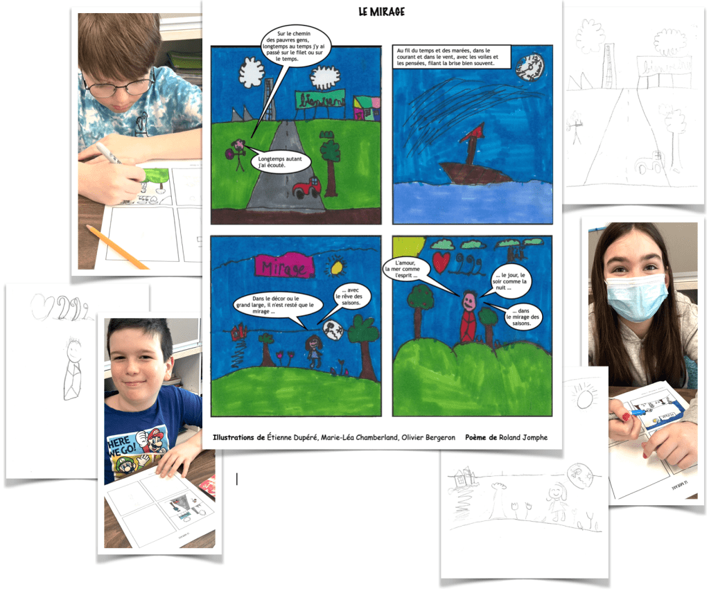 Que c’est magnifique!!! J’ai évalué le projet, je l’ai affiché dans le corridor et j’ai remis à chaque élève leur copie en couleur que tu leur avais préparée. Que de fierté j’ai vu dans leurs yeux! Les élèves et moi avons eu énormément de plaisir à travailler avec toi. Tu as vraiment bien saisi les sujets que je désirais que nous exploitions avec les élèves : poésie et bande dessinée.