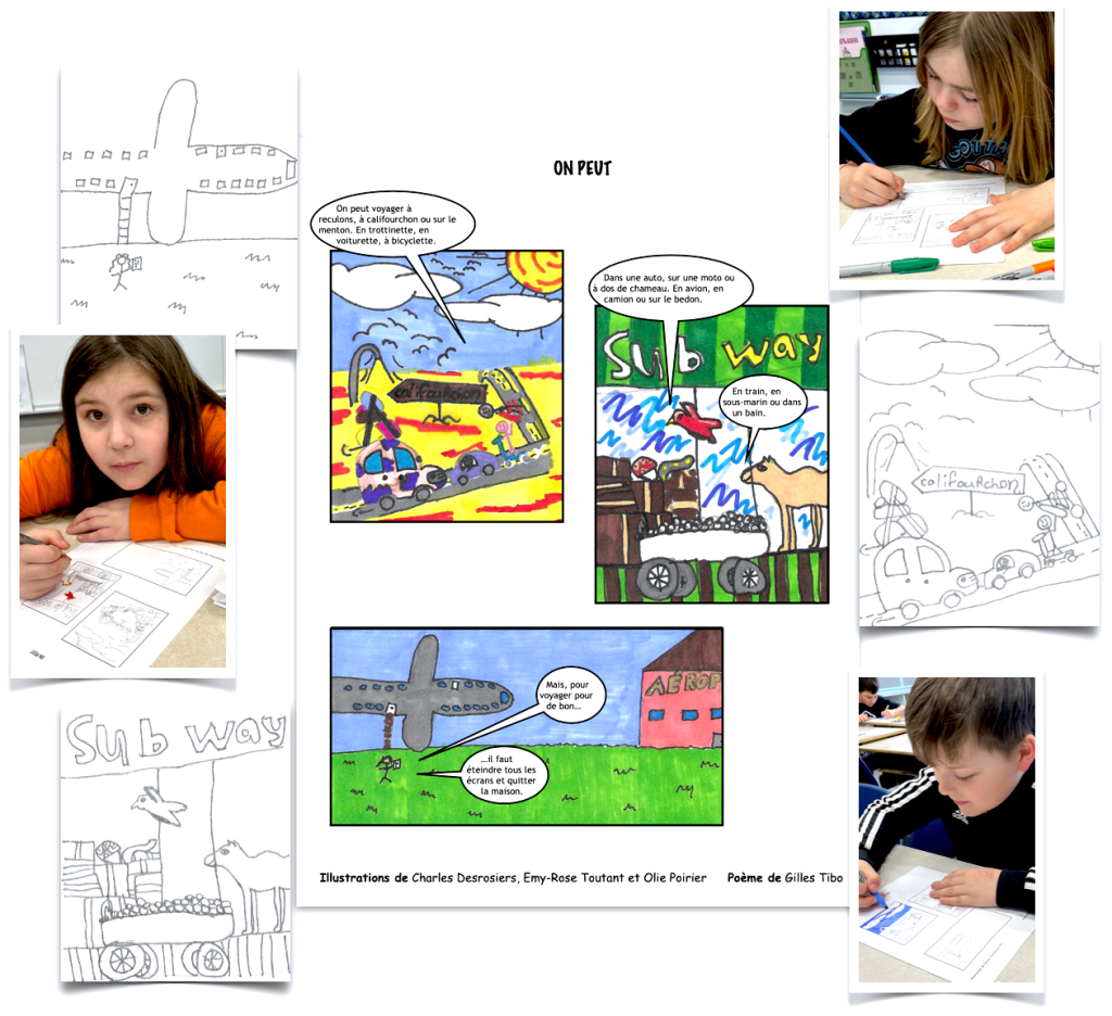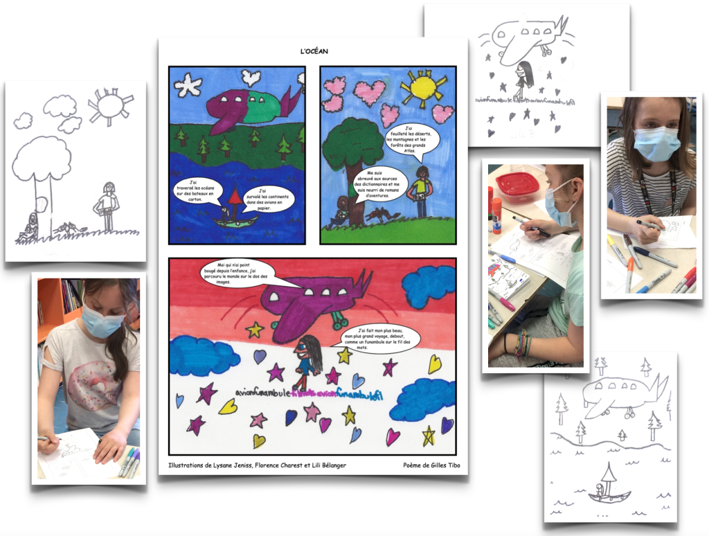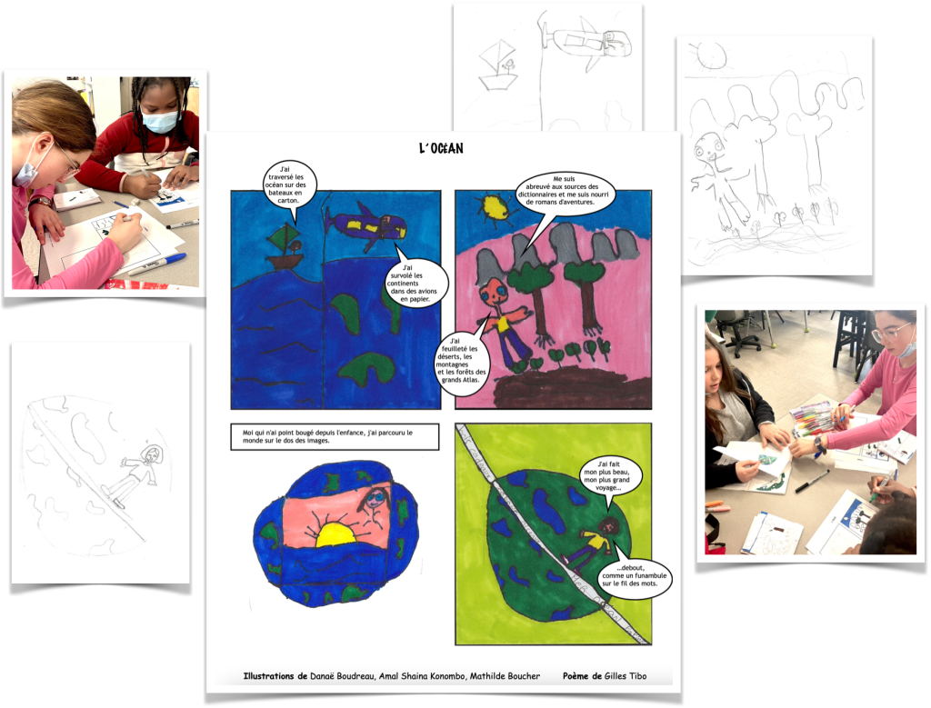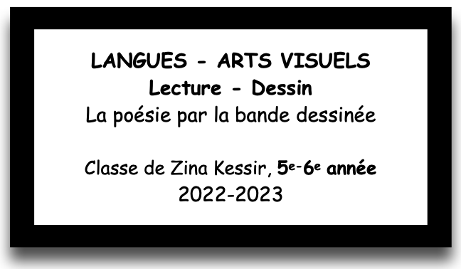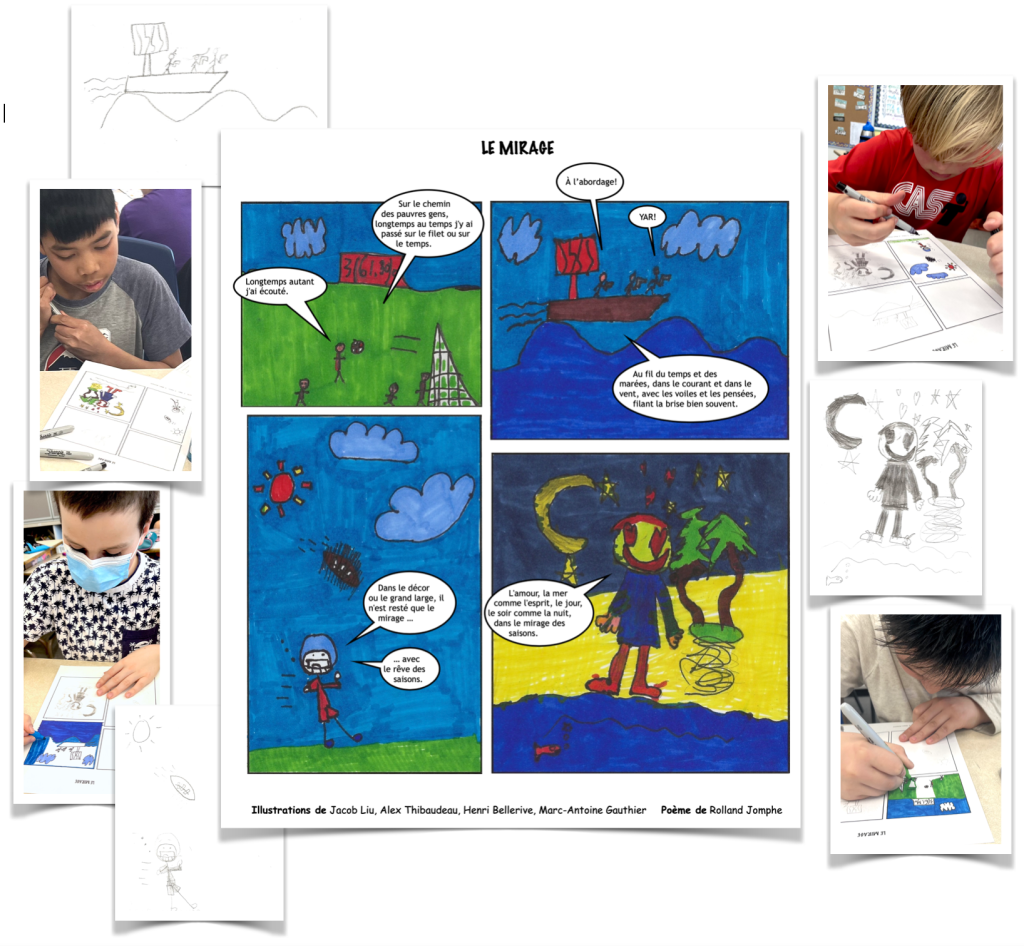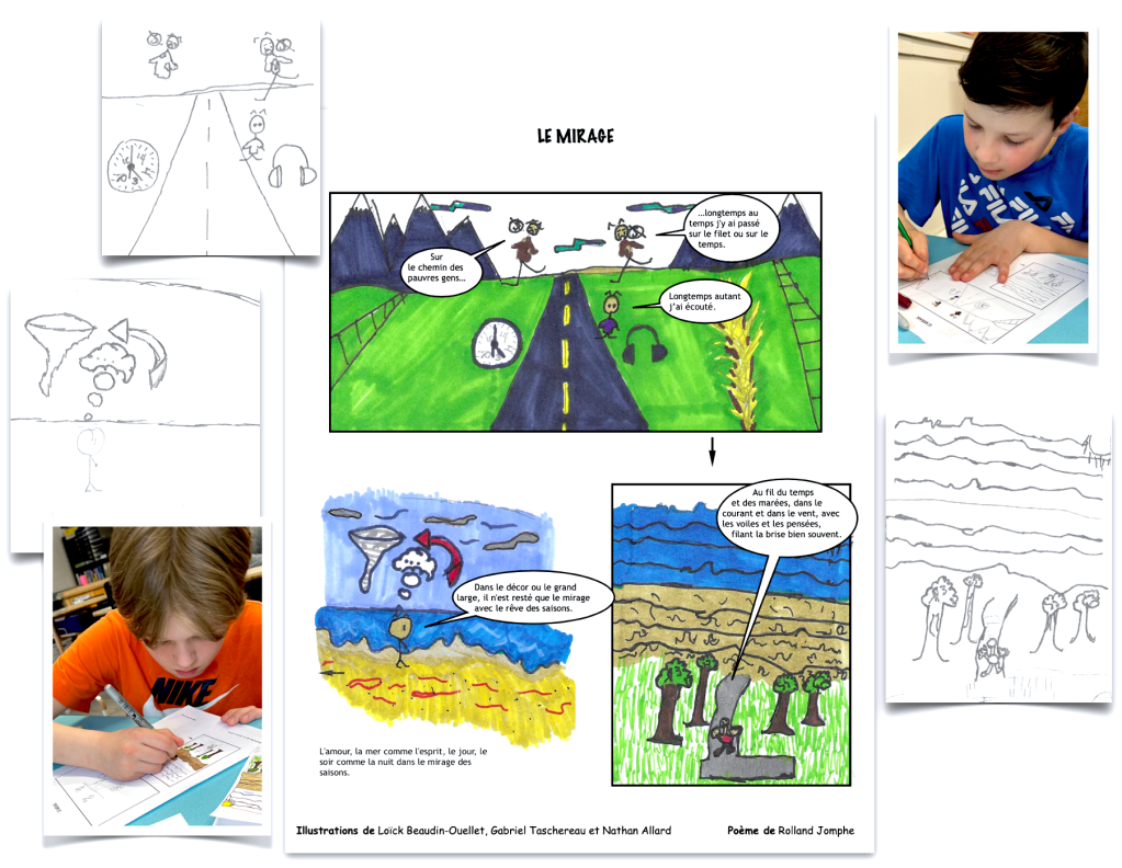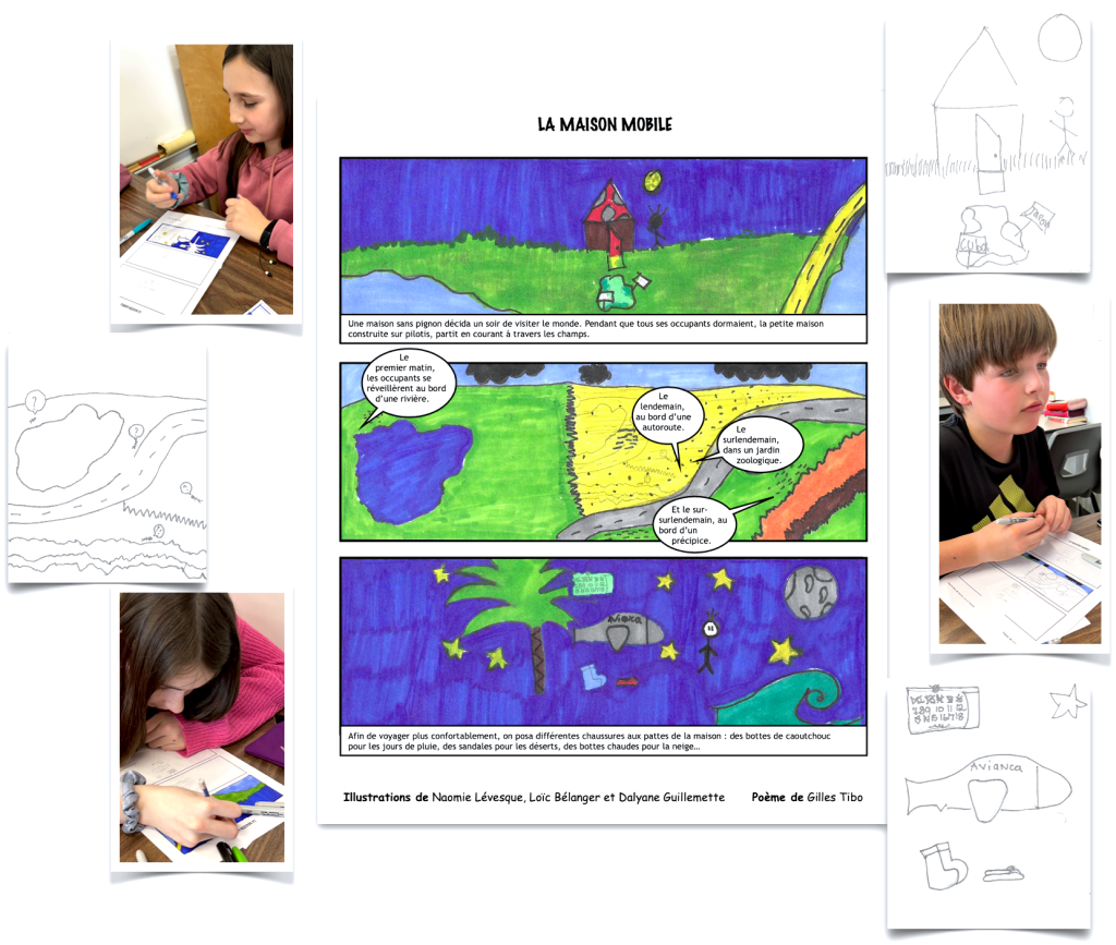 Que c’est magnifique!!! J’ai évalué le projet, je l’ai affiché dans le corridor et j’ai remis à chaque élève leur copie en couleur que tu leur avais préparée. Que de fierté j’ai vu dans leurs yeux! Les élèves et moi avons eu énormément de plaisir à travailler avec toi. Tu as vraiment bien saisi les sujets que je désirais que nous exploitions avec les élèves : poésie et bande dessinée.