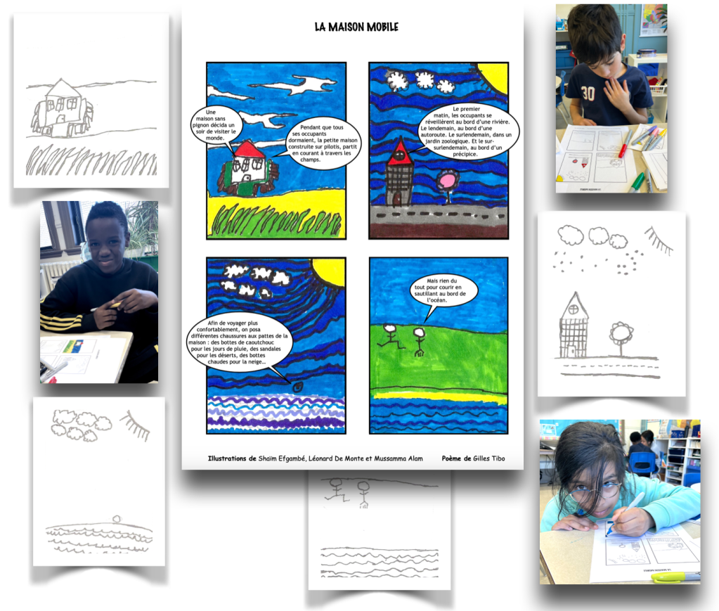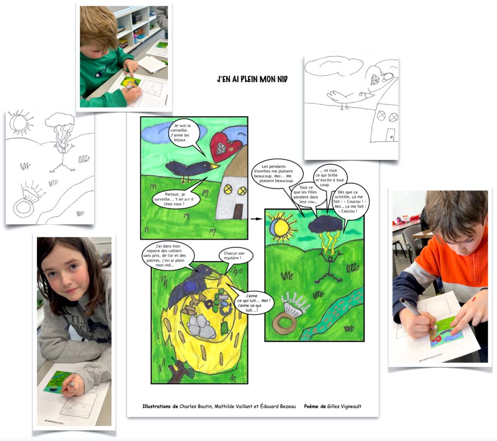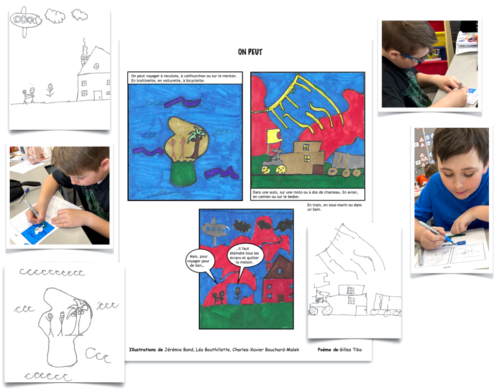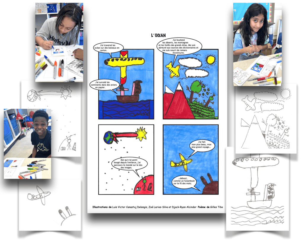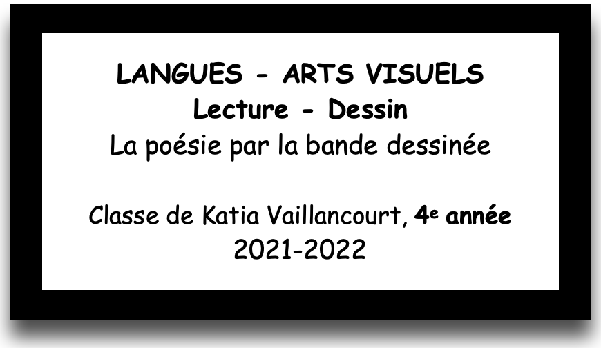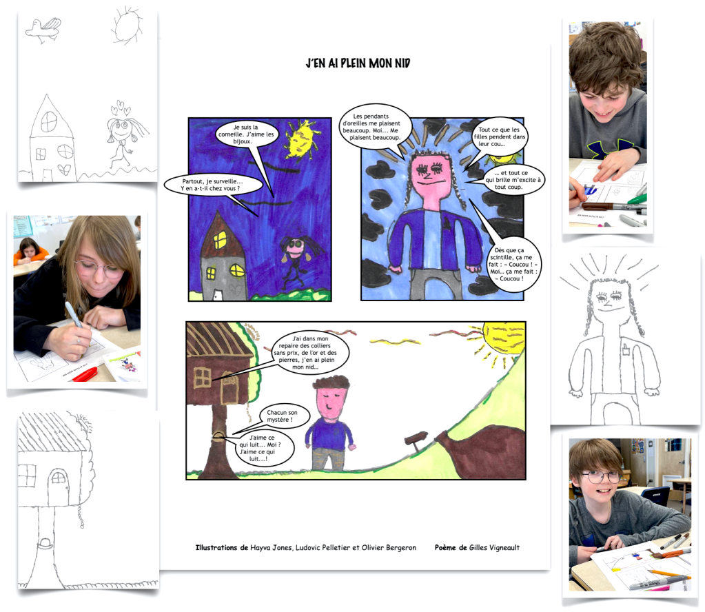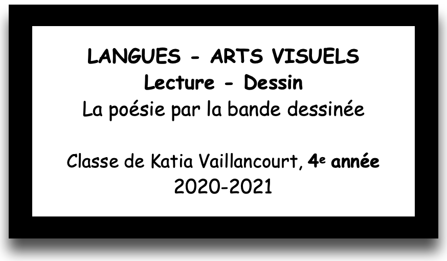 Que c’est magnifique!!! J’ai évalué le projet, je l’ai affiché dans le corridor et j’ai remis à chaque élève leur copie en couleur que tu leur avais préparée. Que de fierté j’ai vu dans leurs yeux! Les élèves et moi avons eu énormément de plaisir à travailler avec toi. Tu as vraiment bien saisi les sujets que je désirais que nous exploitions avec les élèves : poésie et bande dessinée.