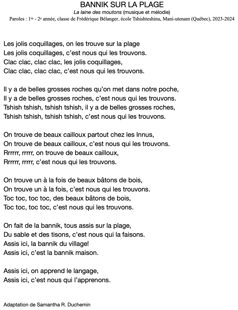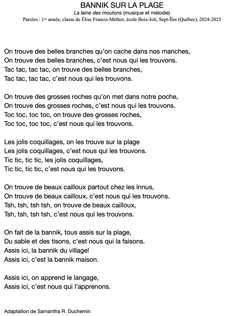 Composer les paroles d’une chanson sur le thème de l’environnement naturel des Innus. Chanter et jouer avec les rimes et le rythme sur la mélodie d’une comptine populaire.