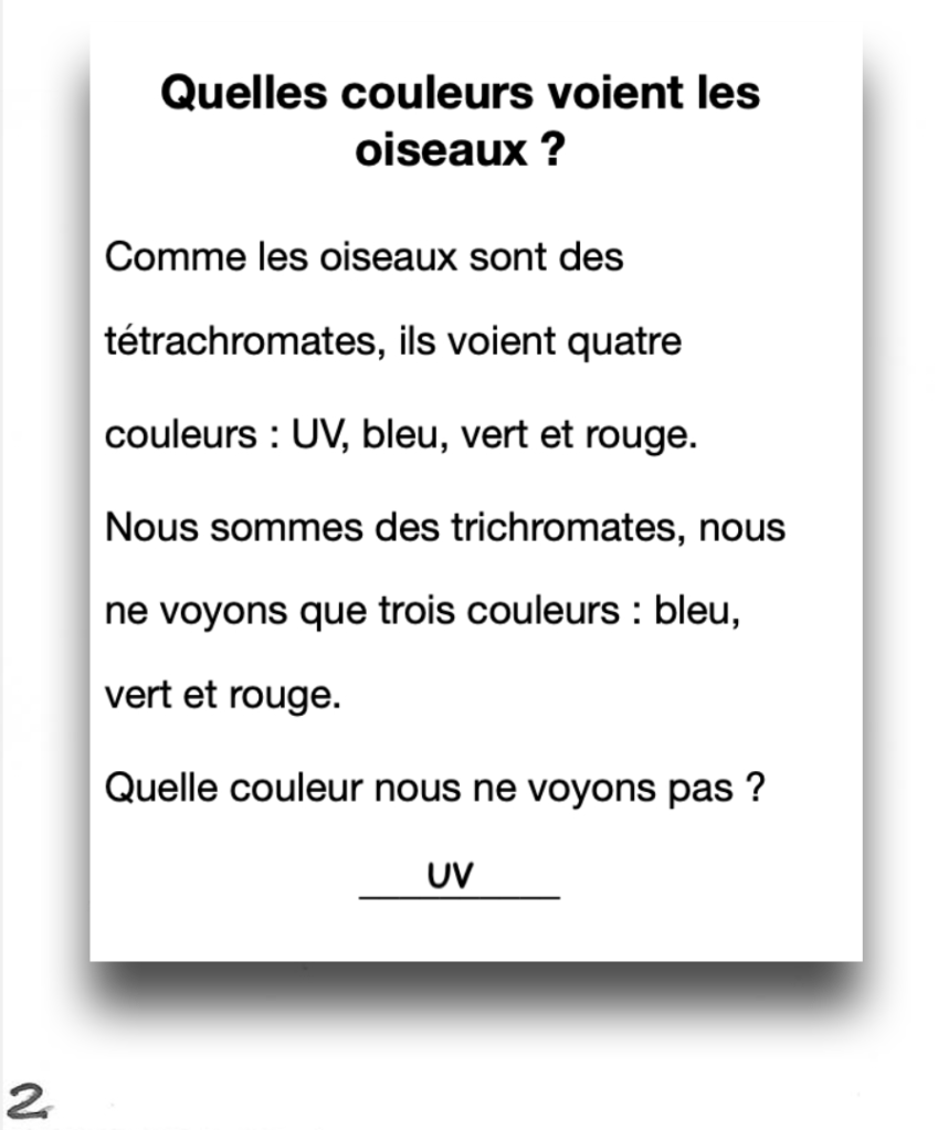 4. Visionner une vidéo sur la vision des humains et des animaux (sur le TBI). Ouvrir une discussion sur les oiseaux et leur capacité à voir ce qu’on ne voit pas. Quelles couleurs voient les oiseaux ? Comme les oiseaux sont des tétrachromates, ils voient quatre couleurs : UV, bleu, vert et rouge, alors que nous sommes des trichromates et nous ne pouvons voir que trois couleurs : bleu, vert et rouge. Coller une photocopie à la page 2 du carnet de traces. Écrire UV dans l’espace prévu, en bas de la page.