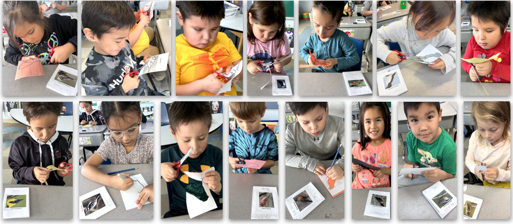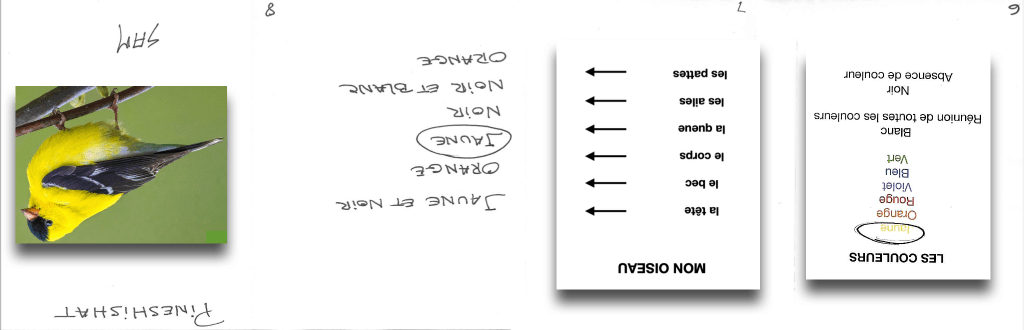 – L’enseignant s’assure que les éléments sont présents dans les carnets de traces : deux noms de l’oiseau encerclés, soit en français et en langue innue (pages 4 et 5), liste de couleurs ; la couleur principale de son oiseau encerclée (page 6), liste des parties du corps d’un oiseau (page 7), couleurs associées à son oiseau (page 8), image couleur d’un oiseau, oiseau en langue innue PINESHISHAT (page couverture), oiseau découpé (inséré entre la page couverture et la page 2).