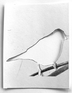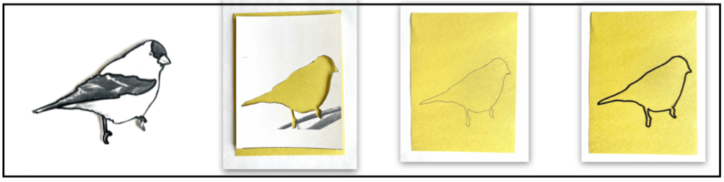 – son oiseau découpé sur la ligne de contour (identifié à son nom et inséré entre la page couverture et la page 2 de son carnet de traces, jour 1)