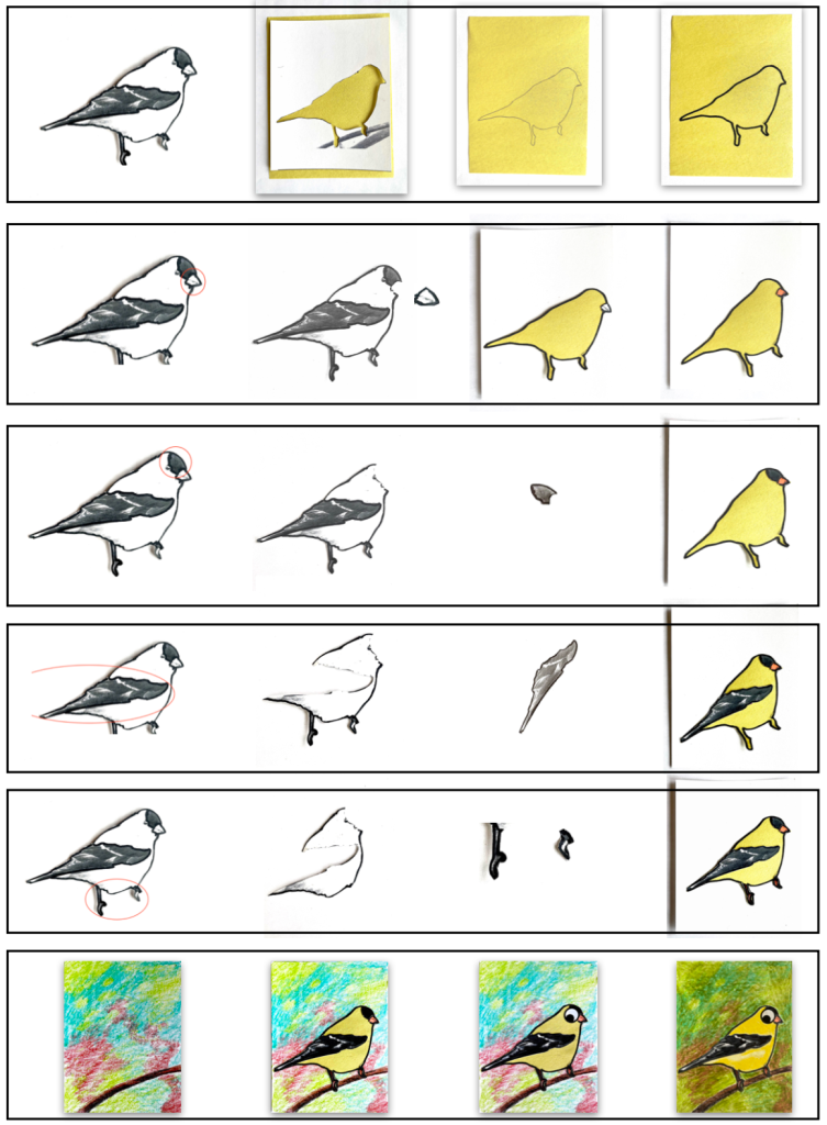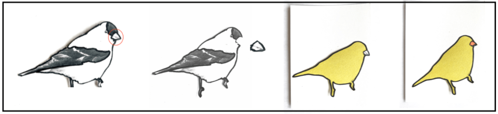 11. Démonstration — À l’aide de l’image de son oiseau (identifié à son nom), découper une partie de l’oiseau sur la ligne de contour (p. ex. : le bec). Coller cette partie au bon endroit sur sa réalisation (papier construction). À l’aide de crayons-feutres, colorier cette partie identique à l’oiseau (utiliser la page couverture du carnet de traces comme référence).