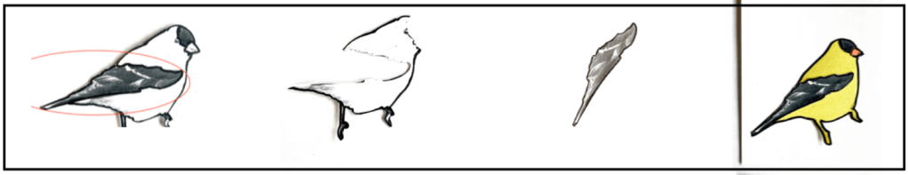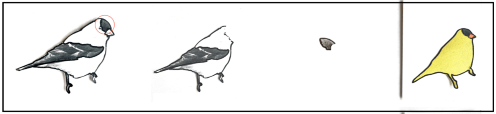 10. Démonstration — Placer un gabarit d’oiseau sur du papier construction ayant la couleur du corps de son oiseau, tracer la ligne de contour au crayon à mine d’abord, puis retracer au crayon-feutre noir. Découper sur la ligne de contour.