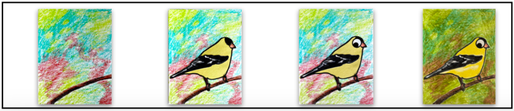 CHARDONNERET JAUNE – Crayons de cire sur carton, 5,5 x 4 pouces.