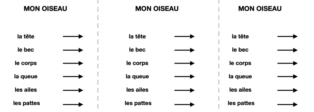 – la liste des parties du corps d’un oiseau, format env. 3 x 4 po (1 par élève).