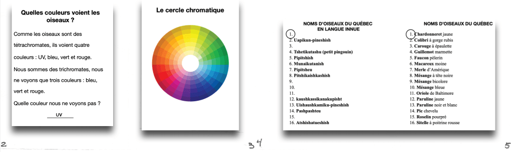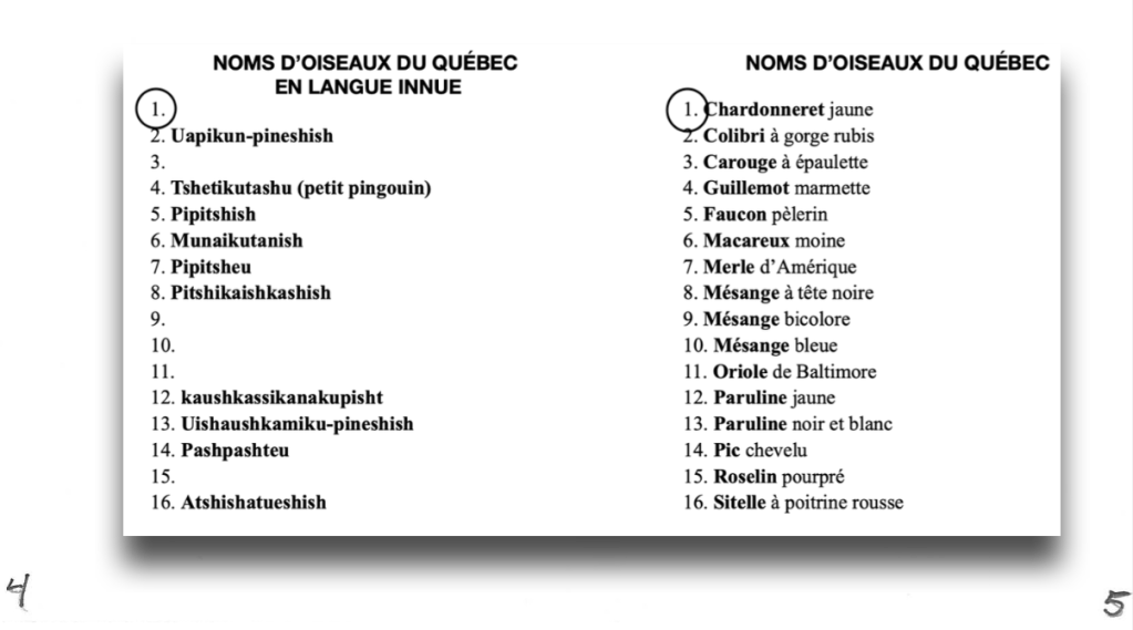 Page 4 : coller une photocopie de noms d’oiseaux en français et en langue innue ; encercler le numéro associé à un oiseau.