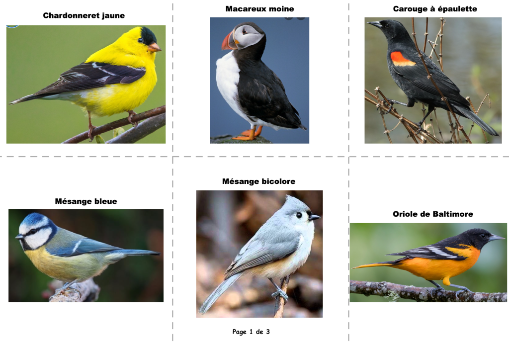 – les images d’oiseaux du Québec en couleur, format env. 3 x 4 po (1 par élève)