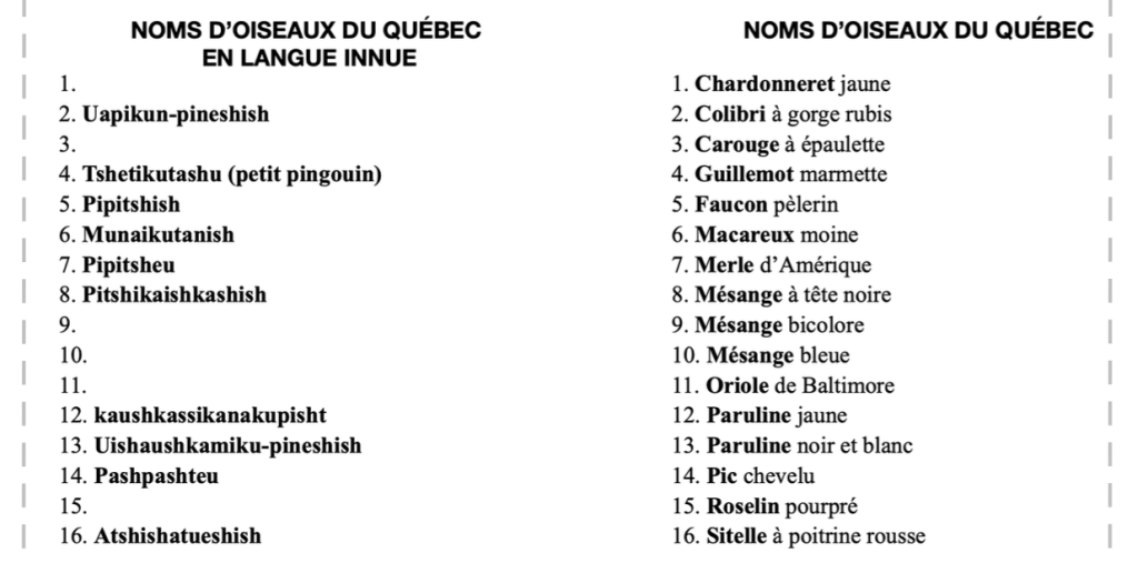 – la liste de noms d’oiseaux en français et en langue innue, format env. 8 x 3 po (1 par élève)