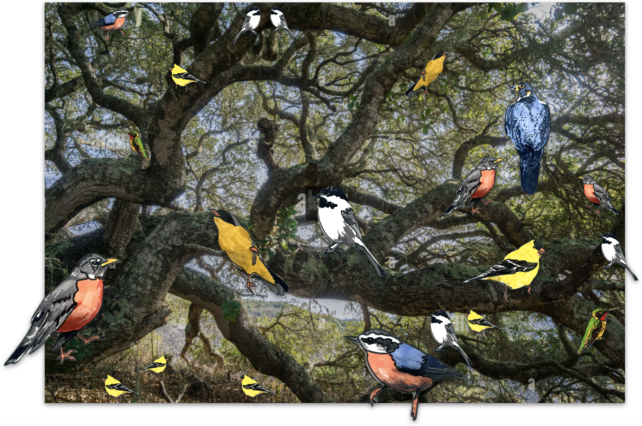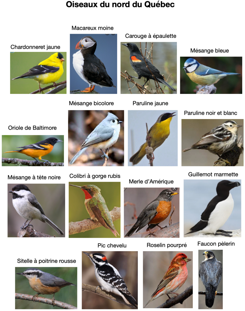 2. Réaliser une murale : imprimer et découper de nouveaux les oiseaux (noir et blanc), colorier au crayons-feutres et coller sur la photographie d’un arbre. Utiliser le document sur les oiseaux du nord du Québec pour réaliser les couleurs appropriées.