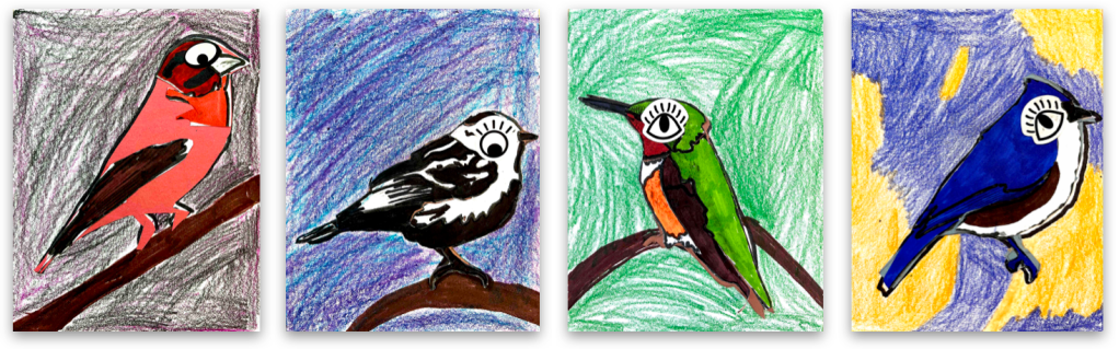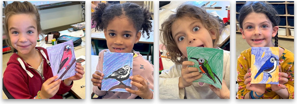 3. Réaliser une exposition : fixer les réalisations sur un fond noir, au mur de la classe ; découper les noms d’oiseaux et placer sous chaque réalisation. Écrire le titre du projet sur une petite une carte, le nom de l’enseignant.e ainsi que l’année en cours et fixer en haut des réalisations.