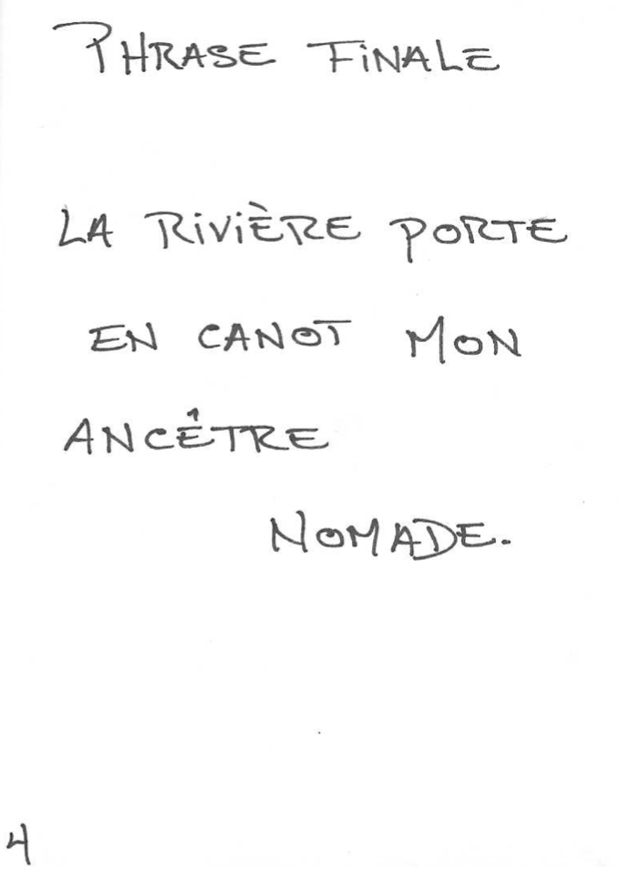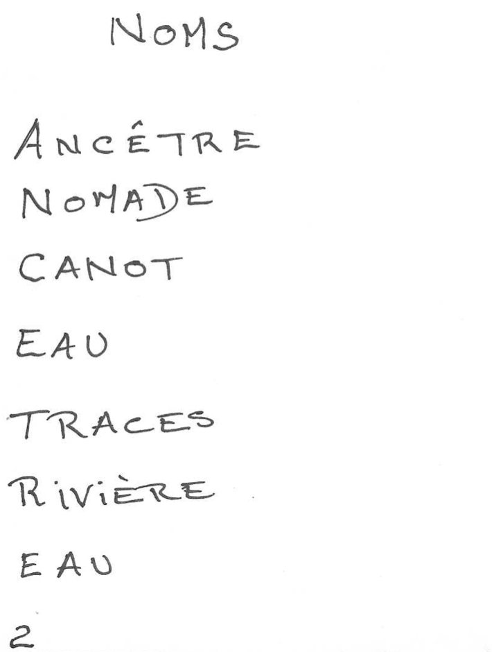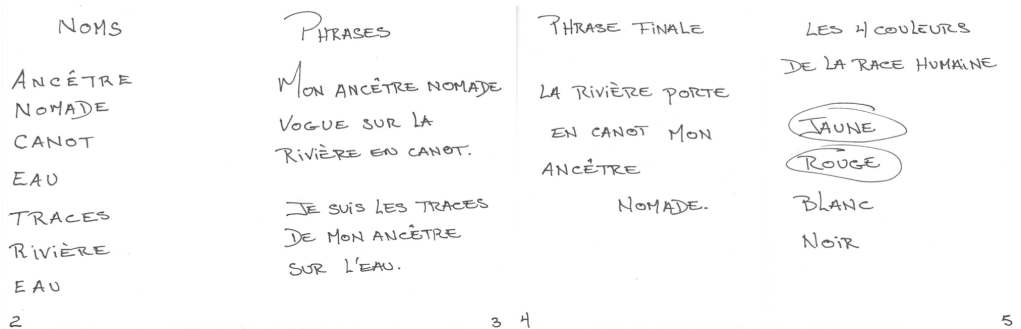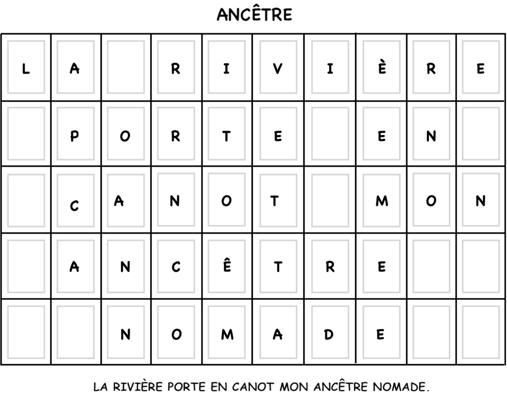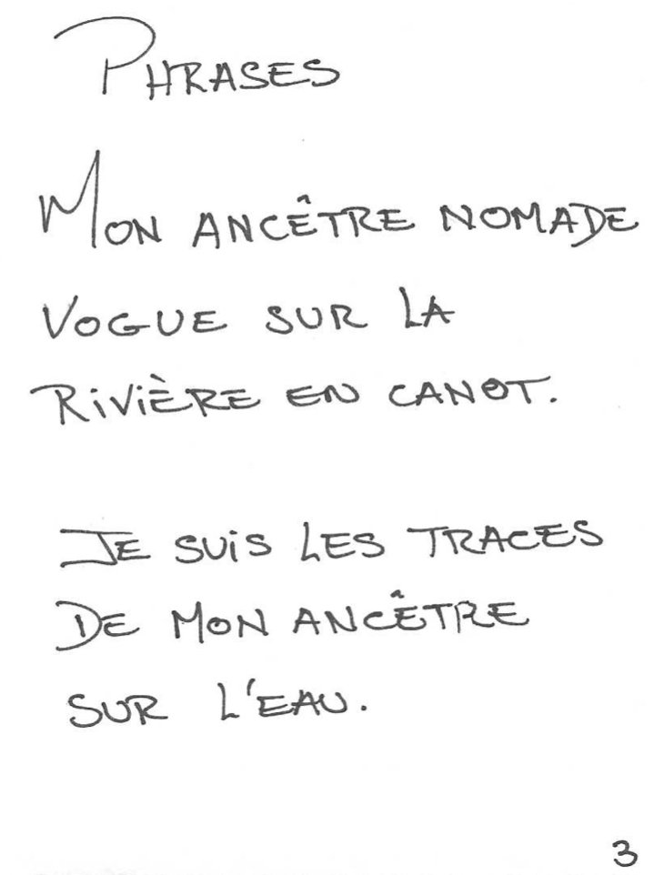 6. Appréciation de deux poèmes innus tirés du recueil Nin Auass (sur le TBI). Utiliser des stratégies de mise en contexte — Rédiger la première version d’une phrase à partir des idées formulées mentalement, page 3. Cette phrase poétique n’aura pas plus de 50 caractères incluant les espaces entre les mots. Elle doit contenir un verbe et sera conçue en utilisant trois ou quatre mots parmi ceux écrits à la page 2. ATTENTION : le mot relié à sa lettre doit figurer dans la phrase.