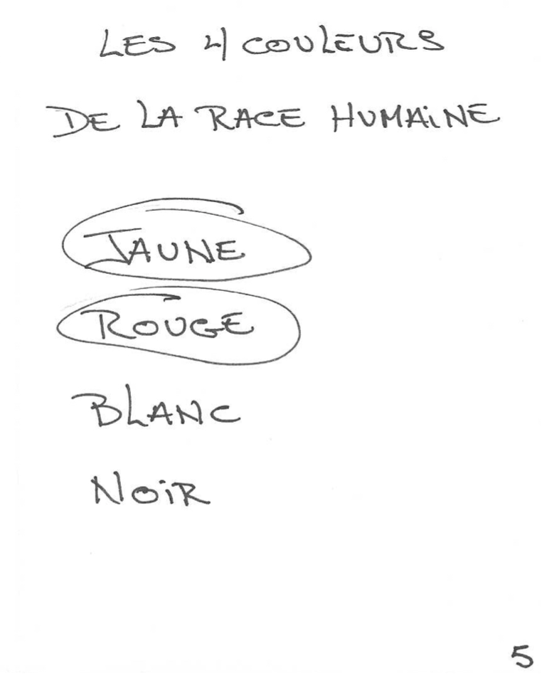 9. Quelles sont les quatre couleurs de la race humaine selon les Innus ? Jaune, rouge, blanc et noir. Écrire à la page 5. Choisir et entourer deux couleurs.