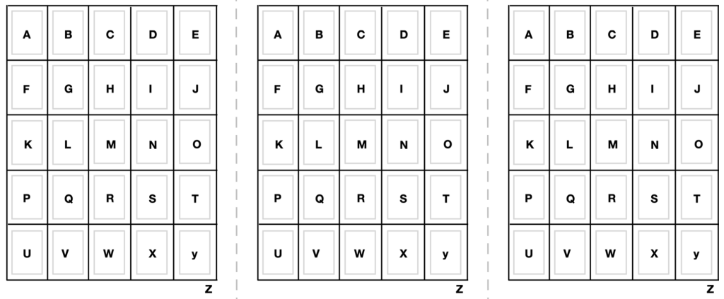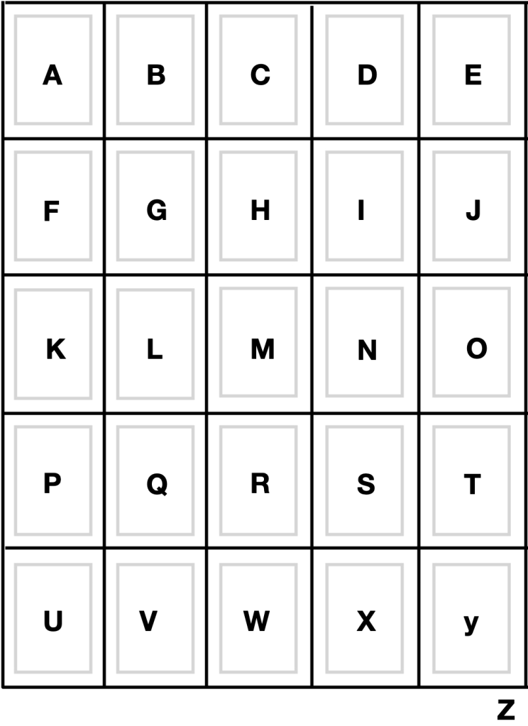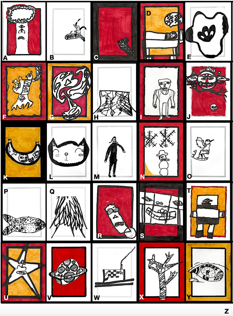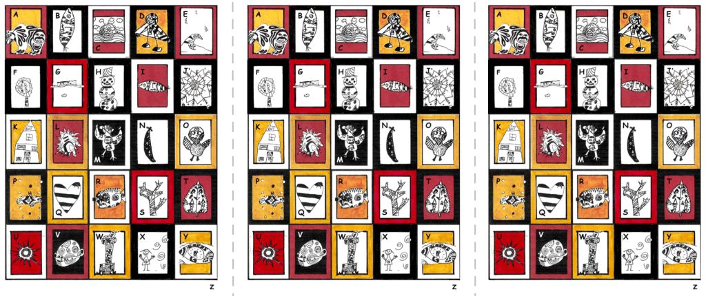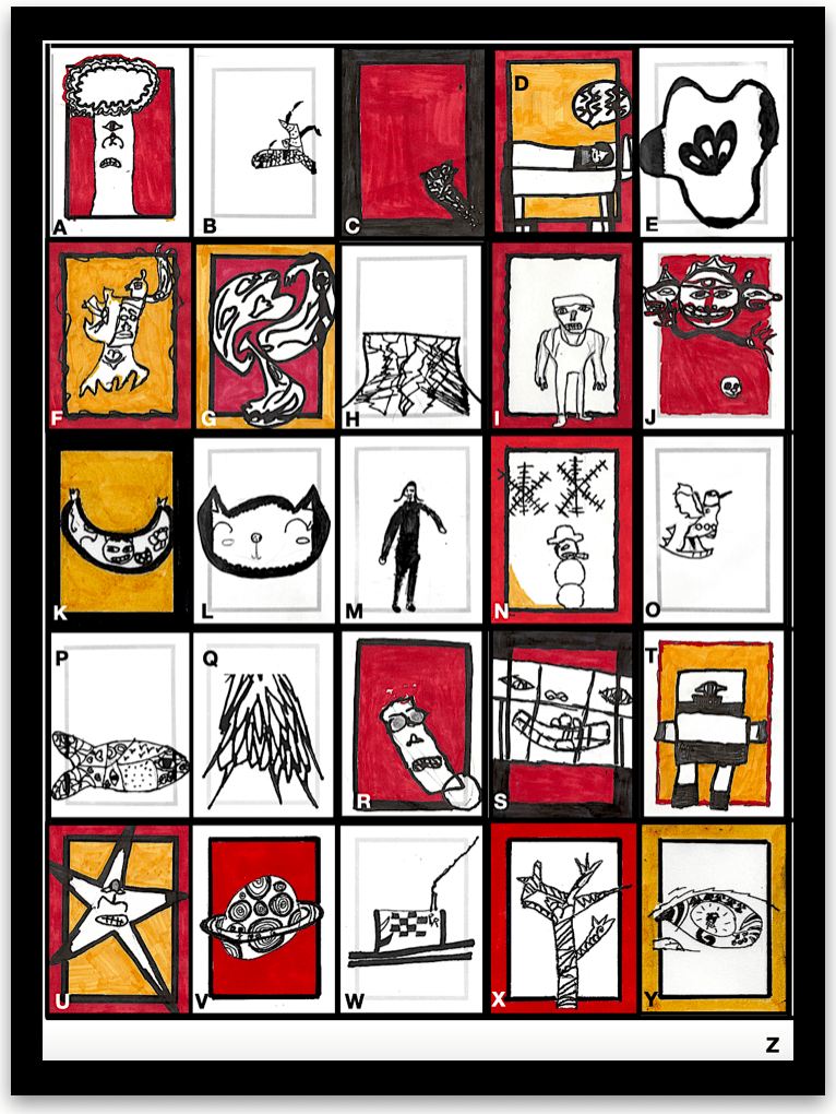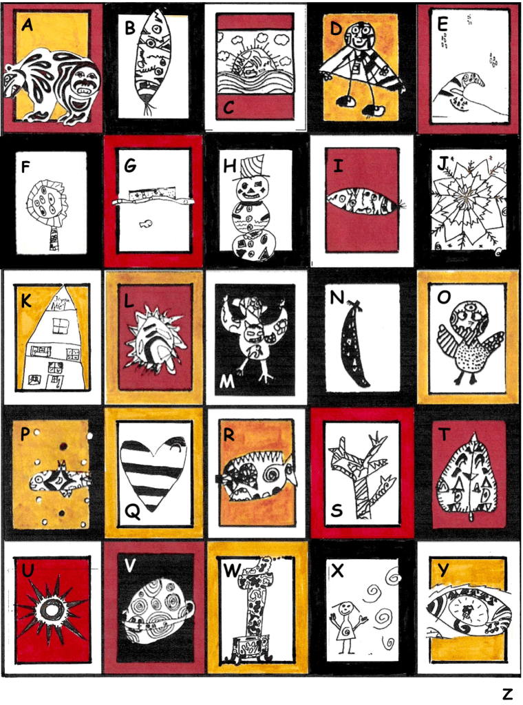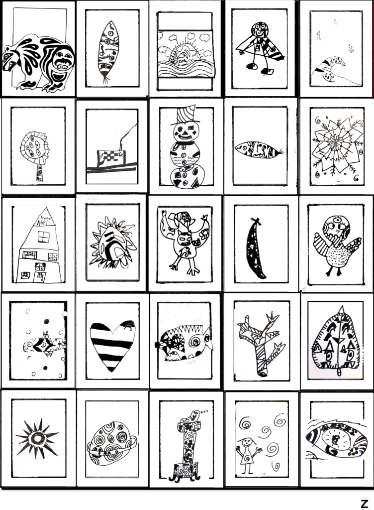 – L’artiste fait la collecte des carnets de traces et des phrases (versions finales). Il photocopie chaque dessin et reproduit l’alphabet en noir et blanc (à partir des photographies réalisées à l’étape 9). Si le nombre d’élèves est inférieur à 26, l’artiste réalise les dessins manquants