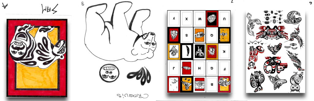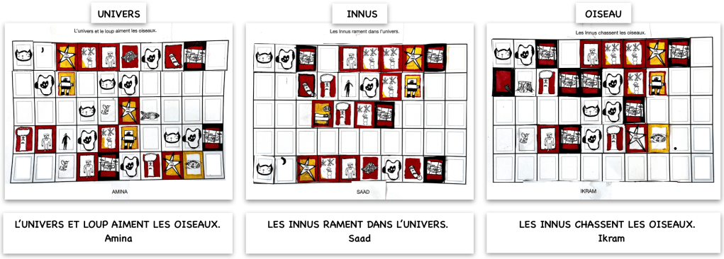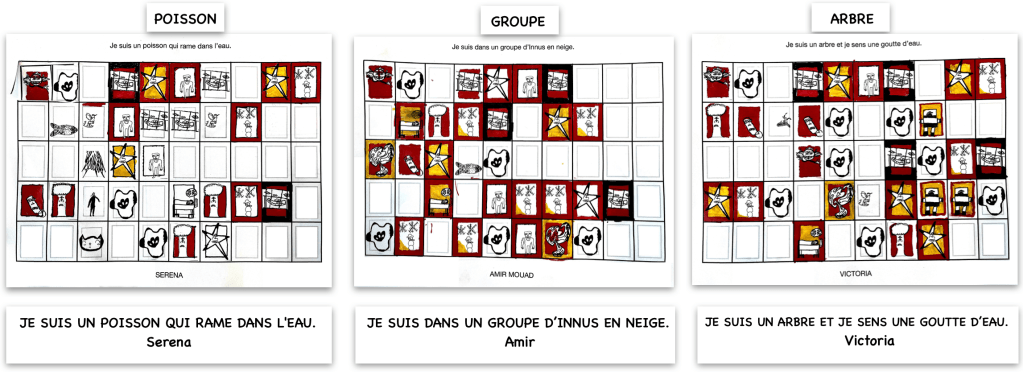 Créer un symbole à la manière des artistes issus des Premières Nations. Illustrer l’alphabet en collectif. Rédiger une phrase se rapportant au mode de vie des Innus, et à l’aide de symboles réalisés par ses pairs, illustrer la phrase.