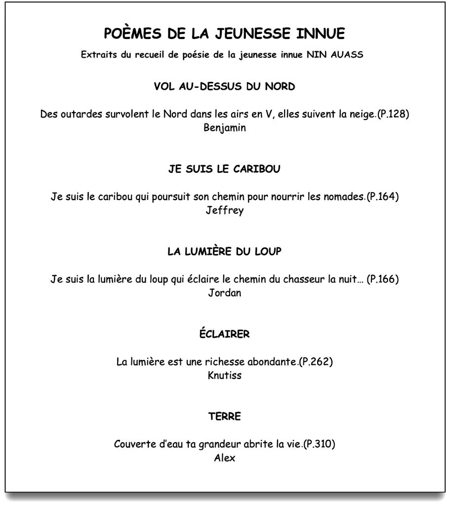 – les poèmes innus tirés du recueil Nin Auass (moi l’enfant) pour appréciation.