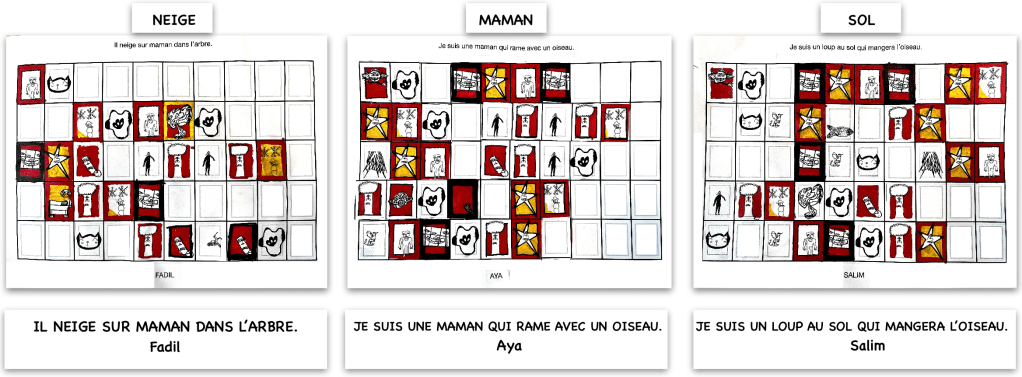 – à partir de la version finale de la phrase de chaque élève (page 4), il remplace les lettres par les dessins en noir et blanc