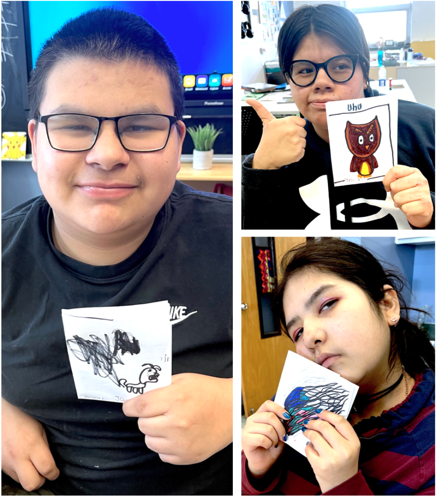 10. Coller une photocopie des six sujets en langue innue (l’oiseau / PINESHISH, le vent / NUTIN, le feu / ISHKUTEU, hibou / UHU, la vague / KASHKAN, le loup / MAIKAN, page 3. Écrire le nom de son sujet en langue innue, en haut de la page couverture de son carnet de traces.