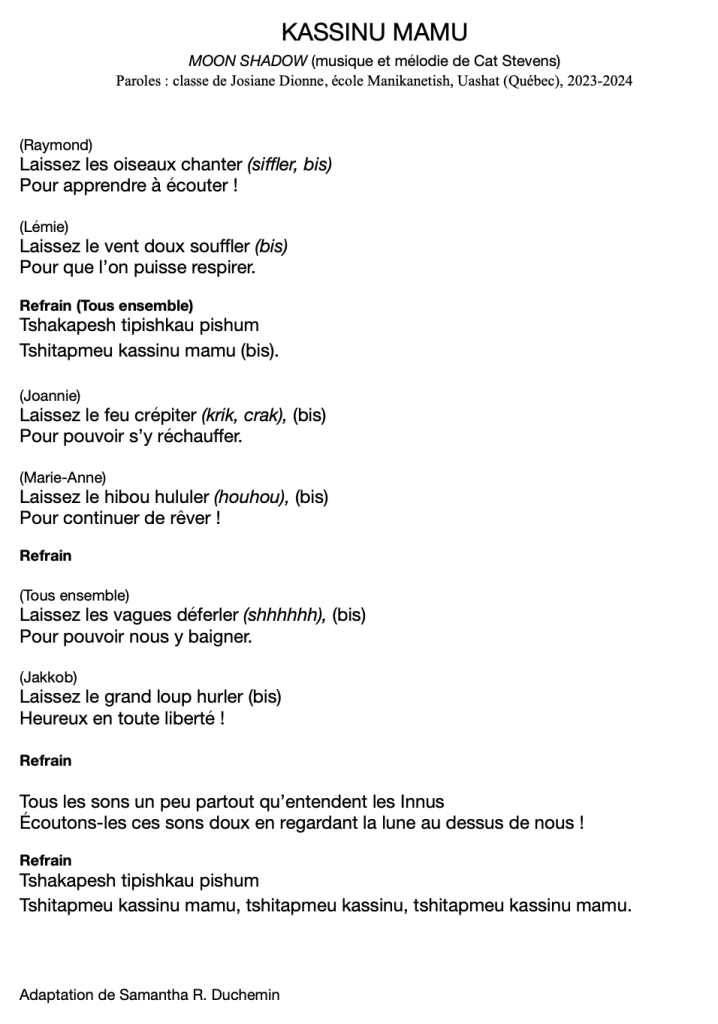 12. Performance de l’artiste sur une guitare à 12 cordes de la musique de la chanson de Cat Stevens, Moon shadow. L’artiste produit les sons associés aux phrases et change le refrain par une phrase en langue innue :