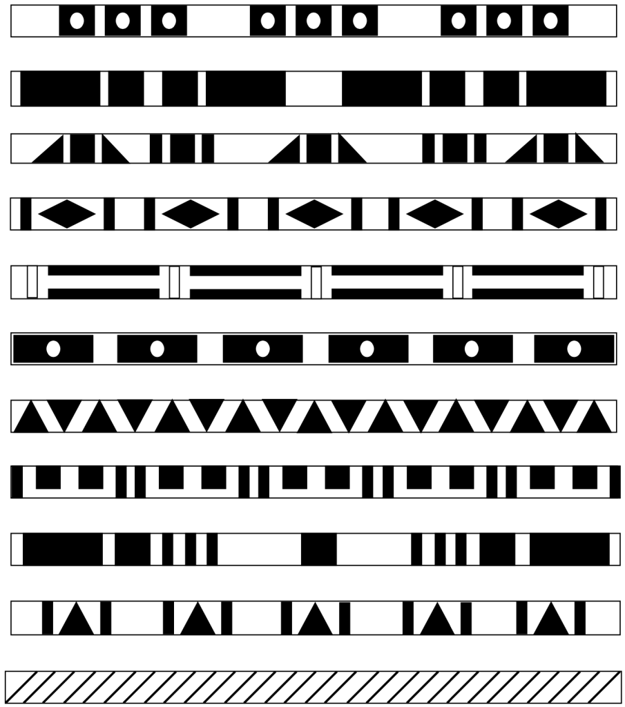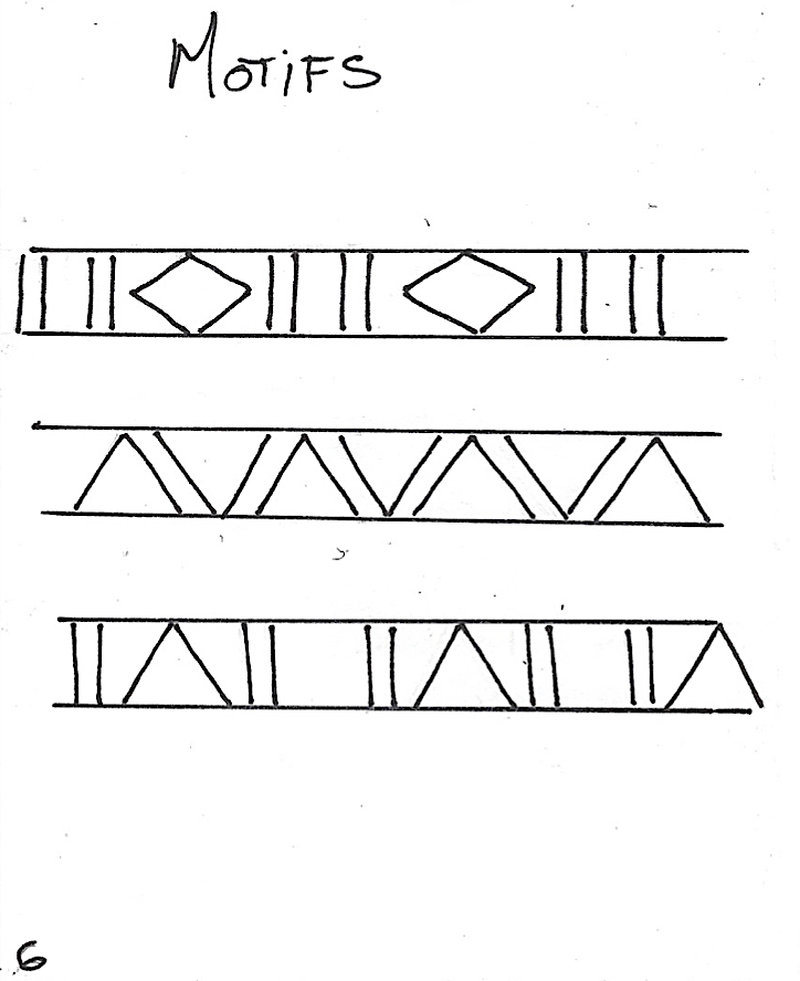 8. Pointer à 1 pouce à partir d’en bas et tracer une ligne horizontale au crayon à mine, page 6. Pointer à chaque pouce vers le haut et tracer six lignes horizontales. À l’aide d’un document sur les motifs (sur le TBI), choisir et tracer quatre motifs à l’intérieur des lignes horizontales.