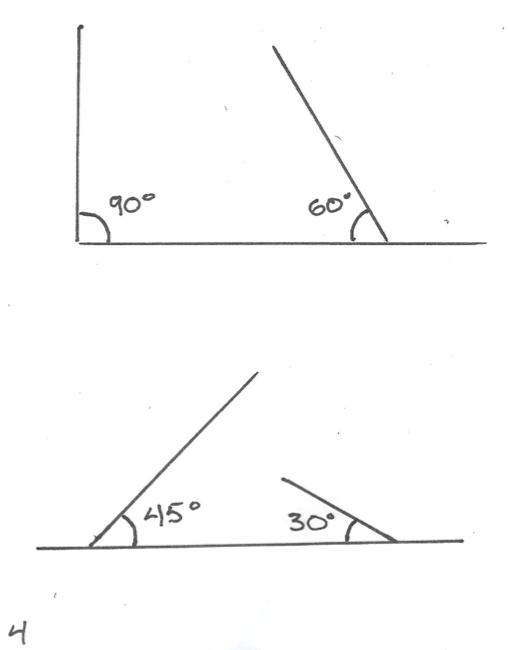 Page 4 : tracer deux lignes horizontales ; rapporter un angle à 90° et un autre à 60° sur la première ligne ; rapporter un angle à 45° et un autre à 30° sur la deuxième ligne.