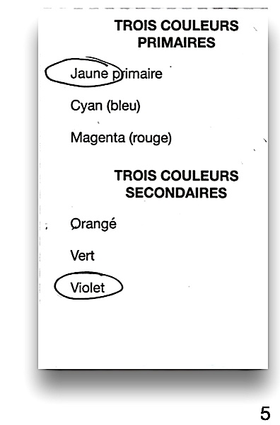 Page 5 : coller une photocopie de la liste des couleurs primaires et secondaires ; entourer le nom de deux couleurs, soit une primaire et une secondaire.