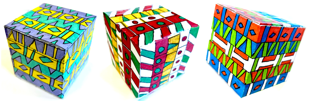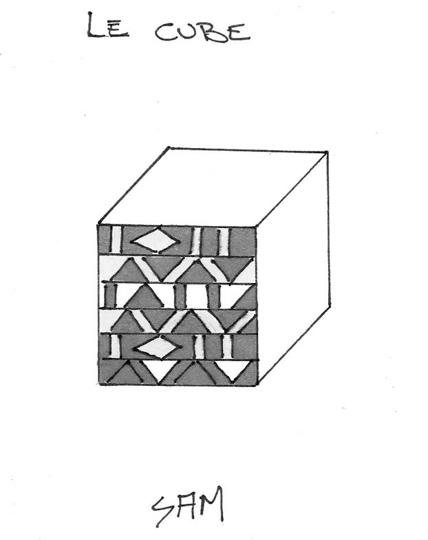 PAGE COUVERTURE : écrire son nom en bas, au centre ; dessiner un cube au centre de la page ; tracer cinq lignes à l’horizontale sur une face ; réaliser quatre motifs ; écrire « cube » en haut de la page.