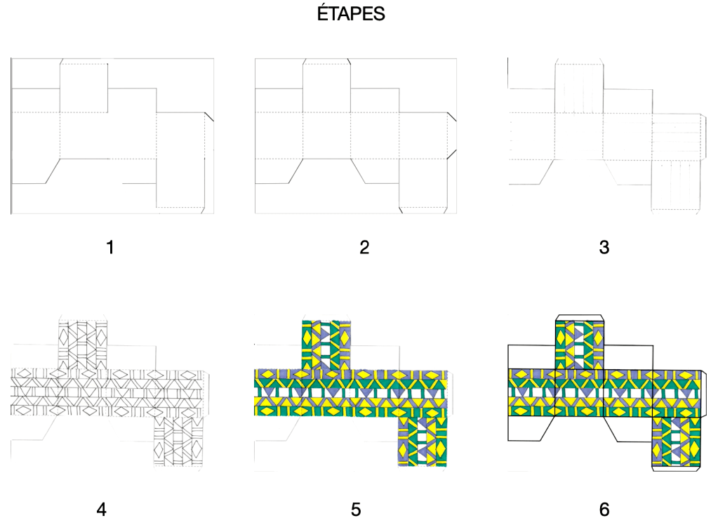 15. Dessiner les motifs choisis à l’intérieur des lignes (voir page couverture), au crayon-feutre noir (pointe fine). *Bien qu’il y ait six motifs sur la page couverture, il n’y en a que cinq sur la boite (omettre une ligne qui ne fonctionne pas très bien avec les autres permet d’améliorer l’effet visuel).