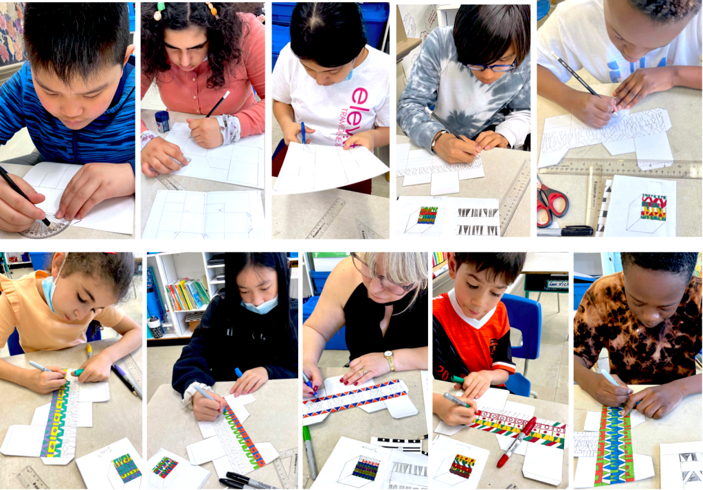 – L’enseignant s’assure que les éléments suivants figurent dans les carnets de traces : angles à 90°, 60°, 45° et 30° (page 4), huit lignes horizontales et quatre motifs autochtones (page 6), deux angles à 90°, deux à 60° et deux à 45° (pages 7 et 8), cube et motifs sur une face (page couverture).