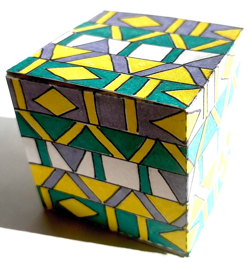 10. Pointer à tous les 0,5 pouces et tracer cinq lignes à 90° sur une face. Dessiner les motifs de la page 6. Retracer les motifs et les lignes de contour du cube au crayon-feutre noir à pointe fine. (Pour éviter de laisser des tâches, placer un papier entre la page couverture et la page 2.) Effacer les traces de crayon à mine. NE PAS COLORIER L’INTÉRIEUR DES MOTIFS.