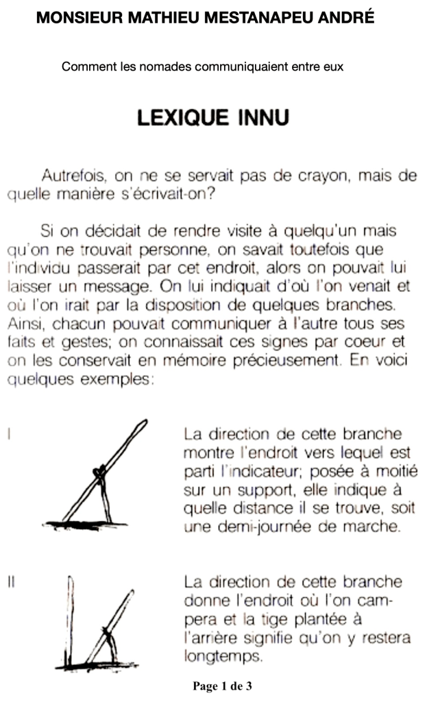 2. Visionner la vidéo sur le mode de vie innu — Message — Production Manitu inc. Durée : 2 min 33 s. Identifier des façons de transmettre des messages en forêt — Comment les nomades communiquaient-ils entre eux ? Par la disposition de quelques branches.