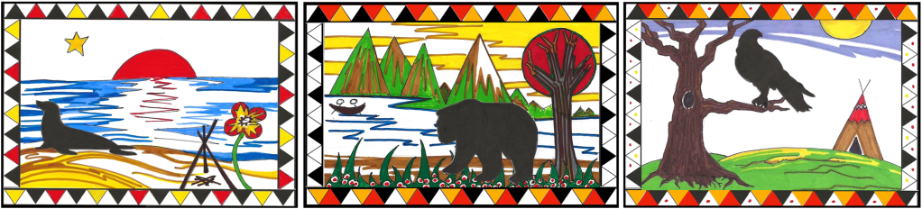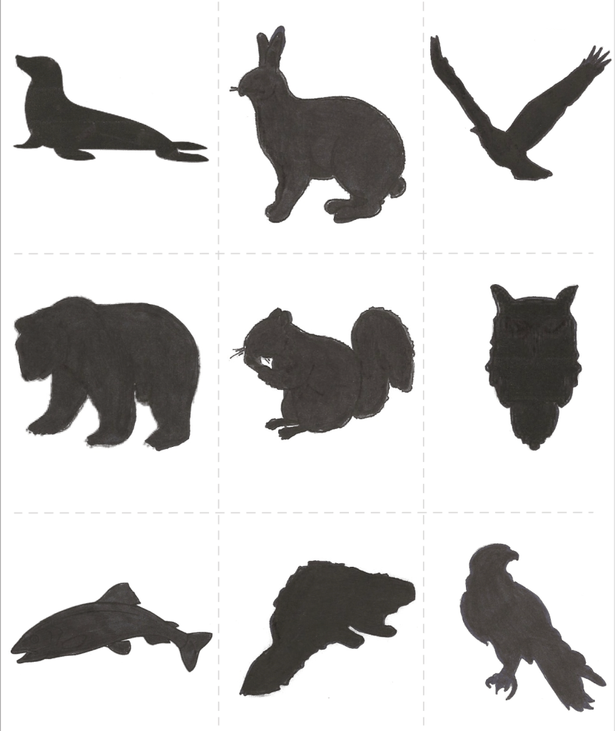 11. Distribuer à chaque élève une photocopie de son animal (animal à découper). Dans quel environnement vit cet animal ? Visualiser l’endroit où il pourrait se trouver et dessiner les éléments retrouvés dans son environnement (p. ex. : l’aigle est souvent perché dans un arbre). Ajouter des éléments retrouvés dans un campement innu en n’utilisant que des lignes courbes et brisées, page 8.